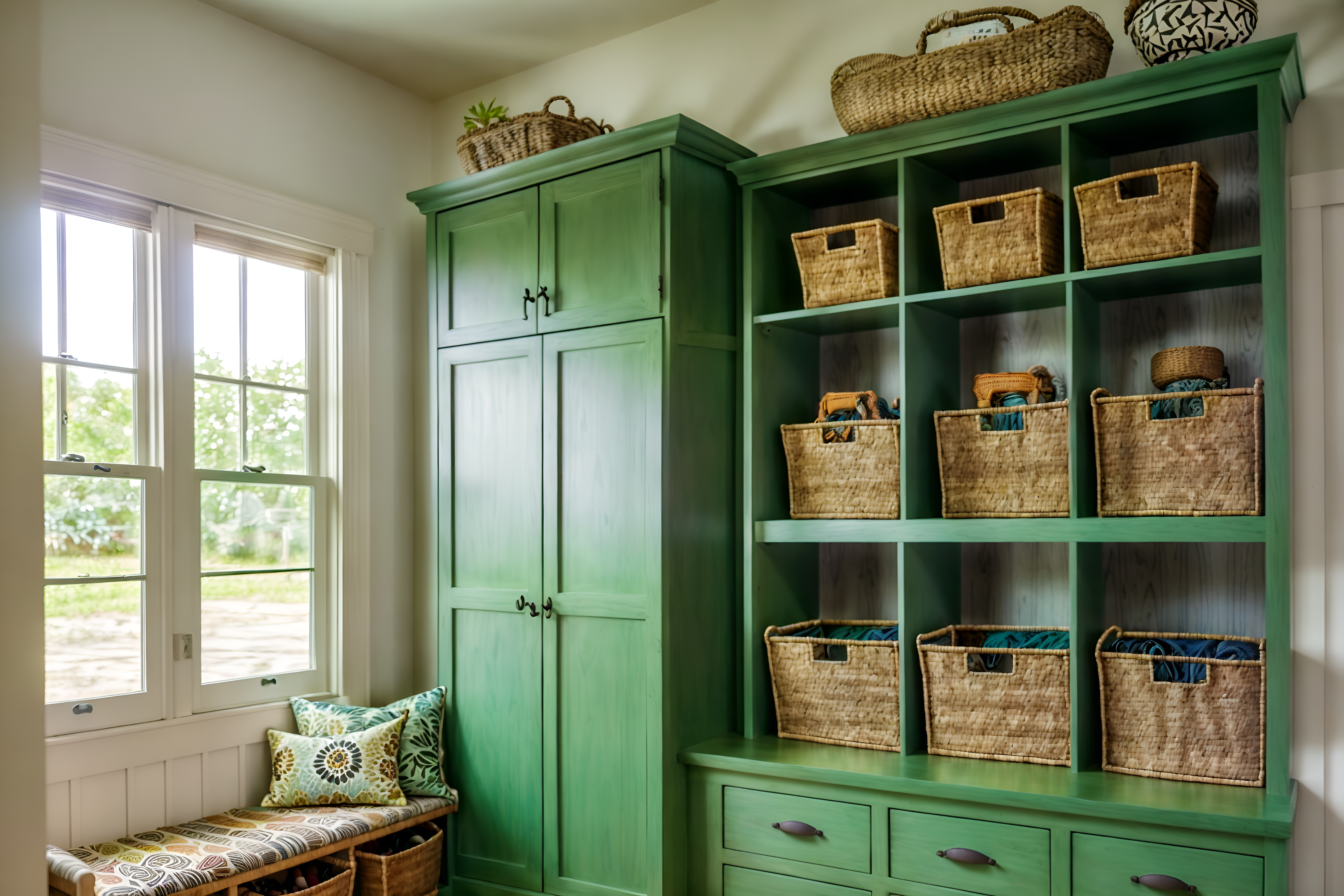 photo from pinterest of bohemian-style interior designed (mudroom interior) with cubbies and storage baskets and high up storage and storage drawers and shelves for shoes and wall hooks for coats and a bench and cabinets. . with carefree layers of pattern, texture, and color and a lack of structure and animal hides and playful colors and mixed patterns and natural materials and bold patterns and lush green nature. . cinematic photo, highly detailed, cinematic lighting, ultra-detailed, ultrarealistic, photorealism, 8k. trending on pinterest. bohemian interior design style. masterpiece, cinematic light, ultrarealistic+, photorealistic+, 8k, raw photo, realistic, sharp focus on eyes, (symmetrical eyes), (intact eyes), hyperrealistic, highest quality, best quality, , highly detailed, masterpiece, best quality, extremely detailed 8k wallpaper, masterpiece, best quality, ultra-detailed, best shadow, detailed background, detailed face, detailed eyes, high contrast, best illumination, detailed face, dulux, caustic, dynamic angle, detailed glow. dramatic lighting. highly detailed, insanely detailed hair, symmetrical, intricate details, professionally retouched, 8k high definition. strong bokeh. award winning photo.