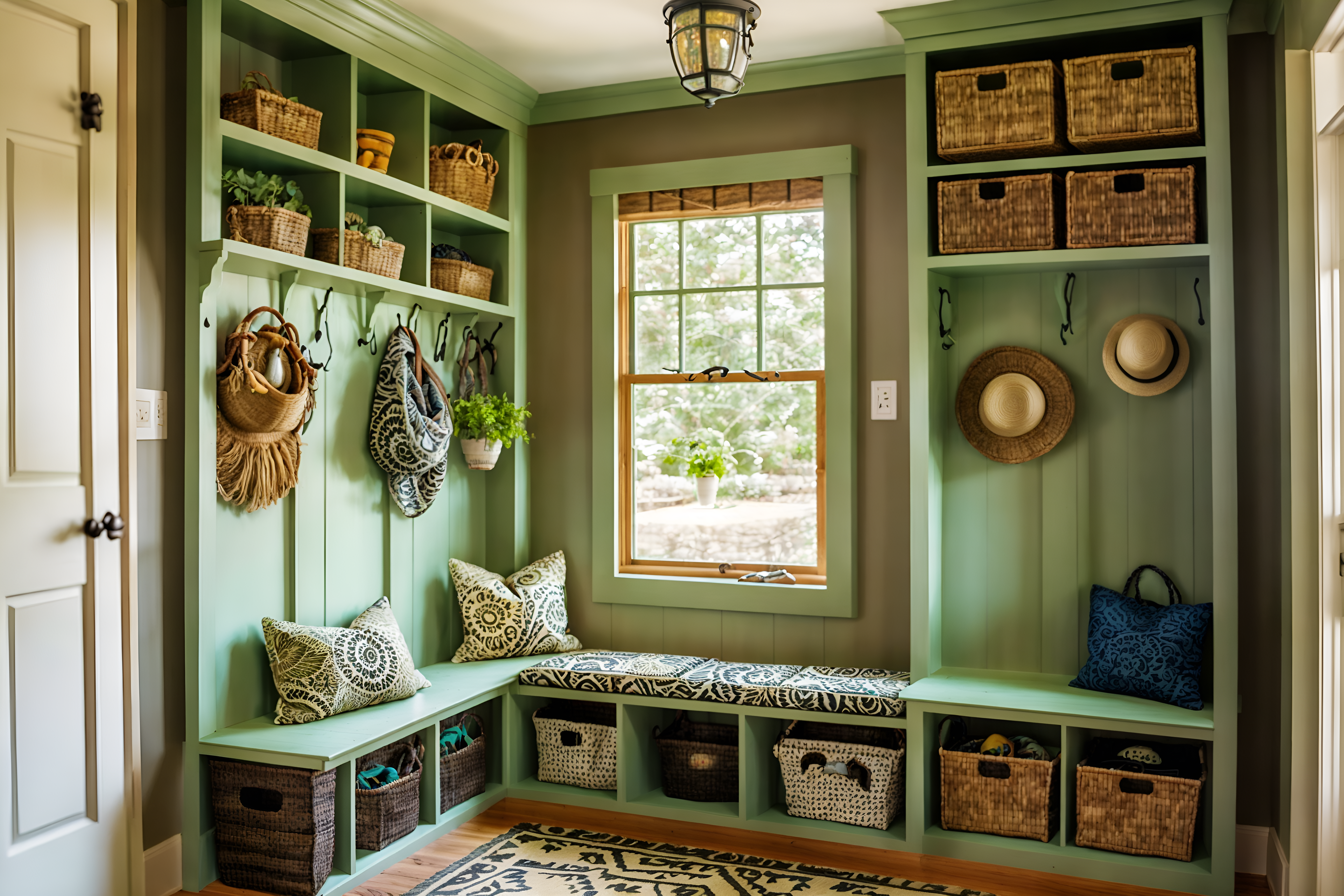 photo from pinterest of bohemian-style interior designed (mudroom interior) with cubbies and storage baskets and high up storage and storage drawers and shelves for shoes and wall hooks for coats and a bench and cabinets. . with carefree layers of pattern, texture, and color and a lack of structure and animal hides and playful colors and mixed patterns and natural materials and bold patterns and lush green nature. . cinematic photo, highly detailed, cinematic lighting, ultra-detailed, ultrarealistic, photorealism, 8k. trending on pinterest. bohemian interior design style. masterpiece, cinematic light, ultrarealistic+, photorealistic+, 8k, raw photo, realistic, sharp focus on eyes, (symmetrical eyes), (intact eyes), hyperrealistic, highest quality, best quality, , highly detailed, masterpiece, best quality, extremely detailed 8k wallpaper, masterpiece, best quality, ultra-detailed, best shadow, detailed background, detailed face, detailed eyes, high contrast, best illumination, detailed face, dulux, caustic, dynamic angle, detailed glow. dramatic lighting. highly detailed, insanely detailed hair, symmetrical, intricate details, professionally retouched, 8k high definition. strong bokeh. award winning photo.