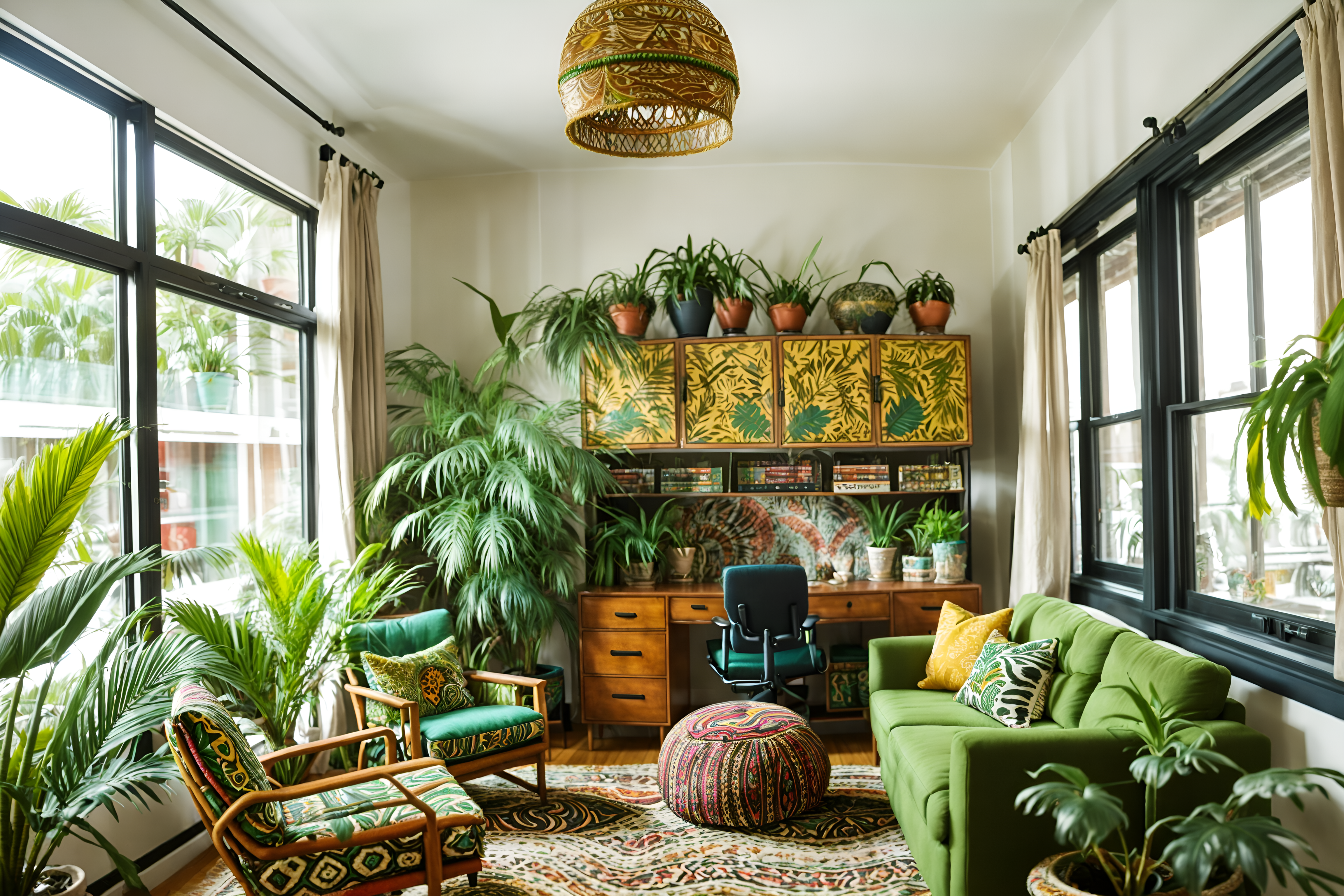 photo from pinterest of bohemian-style interior designed (office interior) with seating area with sofa and lounge chairs and cabinets and office desks and windows and computer desks and office chairs and plants. . with carefree layers of pattern, texture, and color and lush green nature and travel trinkets and bold patterns and playful colors and animal hides and natural materials and playful patterns. . cinematic photo, highly detailed, cinematic lighting, ultra-detailed, ultrarealistic, photorealism, 8k. trending on pinterest. bohemian interior design style. masterpiece, cinematic light, ultrarealistic+, photorealistic+, 8k, raw photo, realistic, sharp focus on eyes, (symmetrical eyes), (intact eyes), hyperrealistic, highest quality, best quality, , highly detailed, masterpiece, best quality, extremely detailed 8k wallpaper, masterpiece, best quality, ultra-detailed, best shadow, detailed background, detailed face, detailed eyes, high contrast, best illumination, detailed face, dulux, caustic, dynamic angle, detailed glow. dramatic lighting. highly detailed, insanely detailed hair, symmetrical, intricate details, professionally retouched, 8k high definition. strong bokeh. award winning photo.