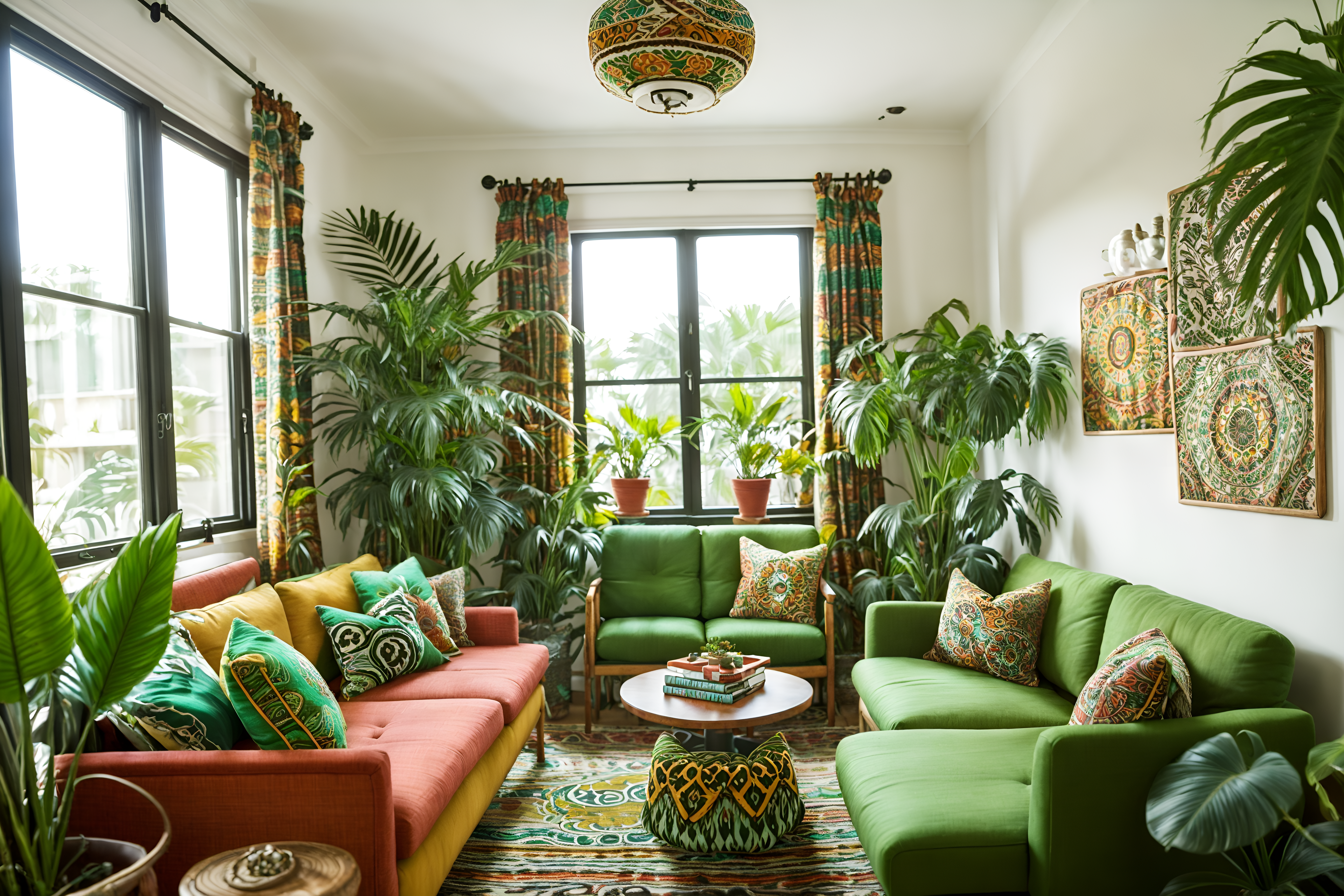 photo from pinterest of bohemian-style interior designed (office interior) with seating area with sofa and lounge chairs and cabinets and office desks and windows and computer desks and office chairs and plants. . with carefree layers of pattern, texture, and color and lush green nature and travel trinkets and bold patterns and playful colors and animal hides and natural materials and playful patterns. . cinematic photo, highly detailed, cinematic lighting, ultra-detailed, ultrarealistic, photorealism, 8k. trending on pinterest. bohemian interior design style. masterpiece, cinematic light, ultrarealistic+, photorealistic+, 8k, raw photo, realistic, sharp focus on eyes, (symmetrical eyes), (intact eyes), hyperrealistic, highest quality, best quality, , highly detailed, masterpiece, best quality, extremely detailed 8k wallpaper, masterpiece, best quality, ultra-detailed, best shadow, detailed background, detailed face, detailed eyes, high contrast, best illumination, detailed face, dulux, caustic, dynamic angle, detailed glow. dramatic lighting. highly detailed, insanely detailed hair, symmetrical, intricate details, professionally retouched, 8k high definition. strong bokeh. award winning photo.