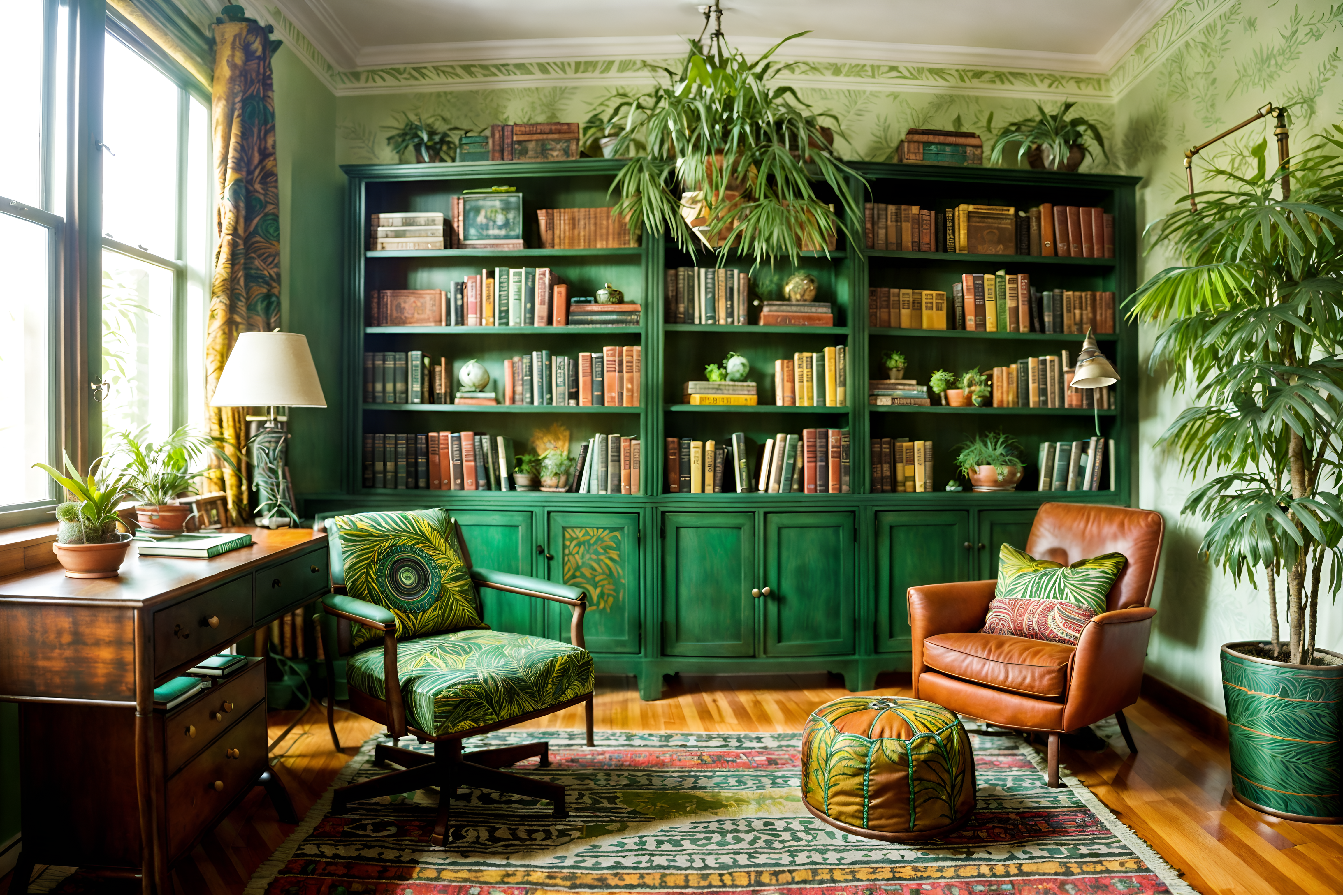 photo from pinterest of bohemian-style interior designed (study room interior) with desk lamp and plant and cabinets and writing desk and lounge chair and bookshelves and office chair and desk lamp. . with carefree layers of pattern, texture, and color and mixed patterns and bold patterns and playful textures and woods and lush green nature and a lack of structure and metals. . cinematic photo, highly detailed, cinematic lighting, ultra-detailed, ultrarealistic, photorealism, 8k. trending on pinterest. bohemian interior design style. masterpiece, cinematic light, ultrarealistic+, photorealistic+, 8k, raw photo, realistic, sharp focus on eyes, (symmetrical eyes), (intact eyes), hyperrealistic, highest quality, best quality, , highly detailed, masterpiece, best quality, extremely detailed 8k wallpaper, masterpiece, best quality, ultra-detailed, best shadow, detailed background, detailed face, detailed eyes, high contrast, best illumination, detailed face, dulux, caustic, dynamic angle, detailed glow. dramatic lighting. highly detailed, insanely detailed hair, symmetrical, intricate details, professionally retouched, 8k high definition. strong bokeh. award winning photo.