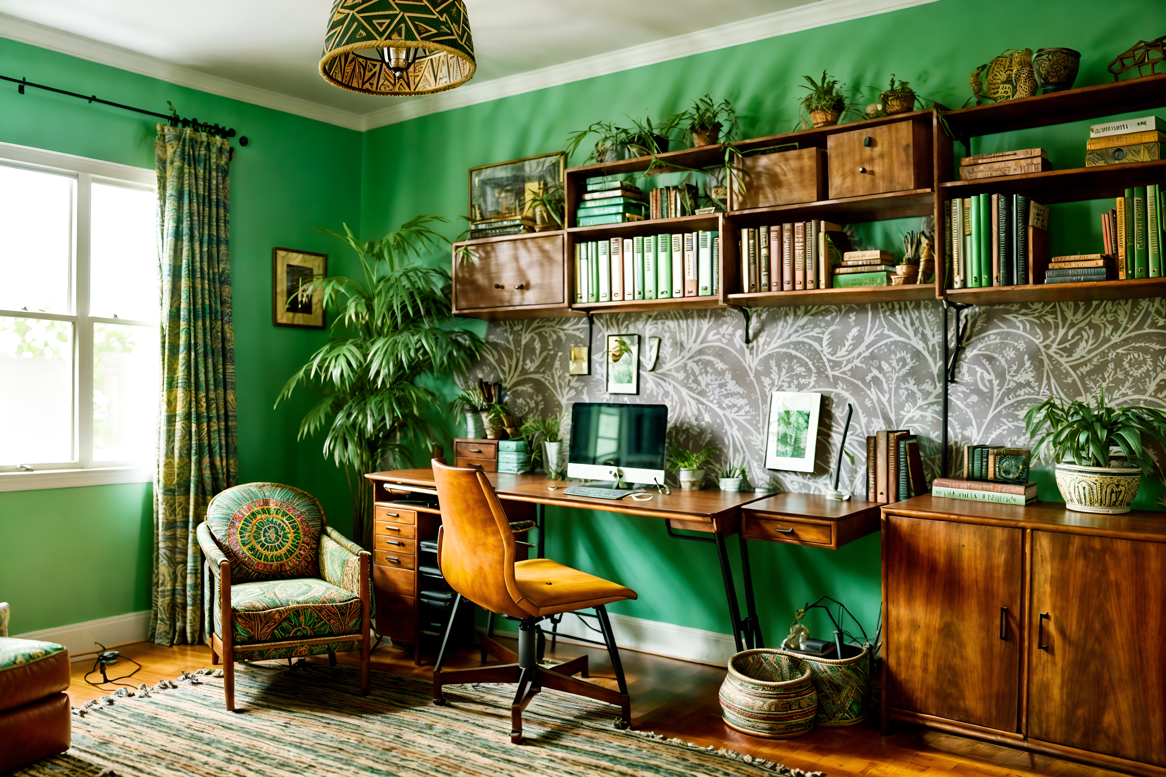 photo from pinterest of bohemian-style interior designed (study room interior) with desk lamp and plant and cabinets and writing desk and lounge chair and bookshelves and office chair and desk lamp. . with carefree layers of pattern, texture, and color and mixed patterns and bold patterns and playful textures and woods and lush green nature and a lack of structure and metals. . cinematic photo, highly detailed, cinematic lighting, ultra-detailed, ultrarealistic, photorealism, 8k. trending on pinterest. bohemian interior design style. masterpiece, cinematic light, ultrarealistic+, photorealistic+, 8k, raw photo, realistic, sharp focus on eyes, (symmetrical eyes), (intact eyes), hyperrealistic, highest quality, best quality, , highly detailed, masterpiece, best quality, extremely detailed 8k wallpaper, masterpiece, best quality, ultra-detailed, best shadow, detailed background, detailed face, detailed eyes, high contrast, best illumination, detailed face, dulux, caustic, dynamic angle, detailed glow. dramatic lighting. highly detailed, insanely detailed hair, symmetrical, intricate details, professionally retouched, 8k high definition. strong bokeh. award winning photo.