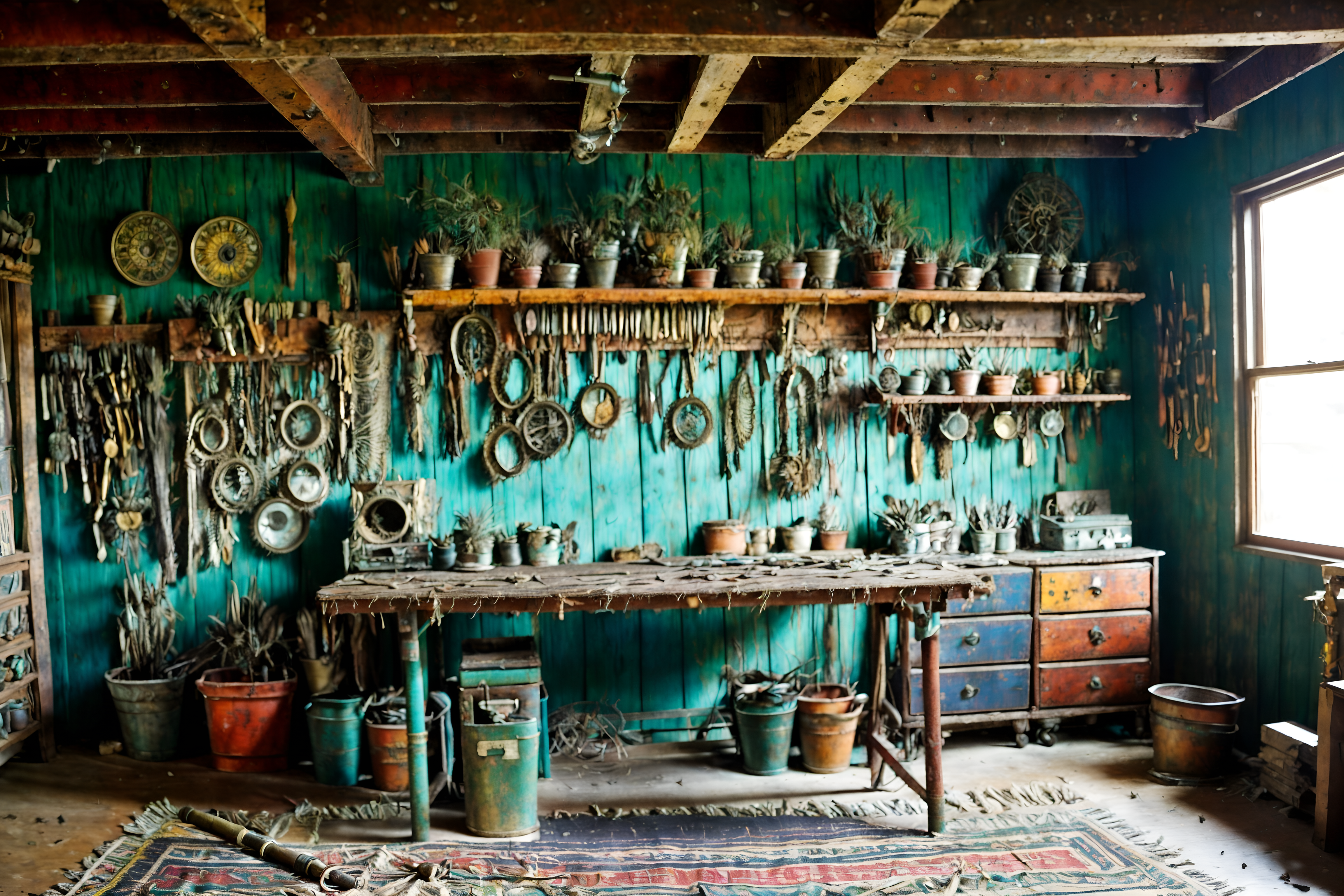 photo from pinterest of bohemian-style interior designed (workshop interior) with messy and wooden workbench and tool wall and messy. . with metals and natural materials and playful colors and bold colors and animal hides and a lack of structure and carefree layers of pattern, texture, and color and playful textures. . cinematic photo, highly detailed, cinematic lighting, ultra-detailed, ultrarealistic, photorealism, 8k. trending on pinterest. bohemian interior design style. masterpiece, cinematic light, ultrarealistic+, photorealistic+, 8k, raw photo, realistic, sharp focus on eyes, (symmetrical eyes), (intact eyes), hyperrealistic, highest quality, best quality, , highly detailed, masterpiece, best quality, extremely detailed 8k wallpaper, masterpiece, best quality, ultra-detailed, best shadow, detailed background, detailed face, detailed eyes, high contrast, best illumination, detailed face, dulux, caustic, dynamic angle, detailed glow. dramatic lighting. highly detailed, insanely detailed hair, symmetrical, intricate details, professionally retouched, 8k high definition. strong bokeh. award winning photo.