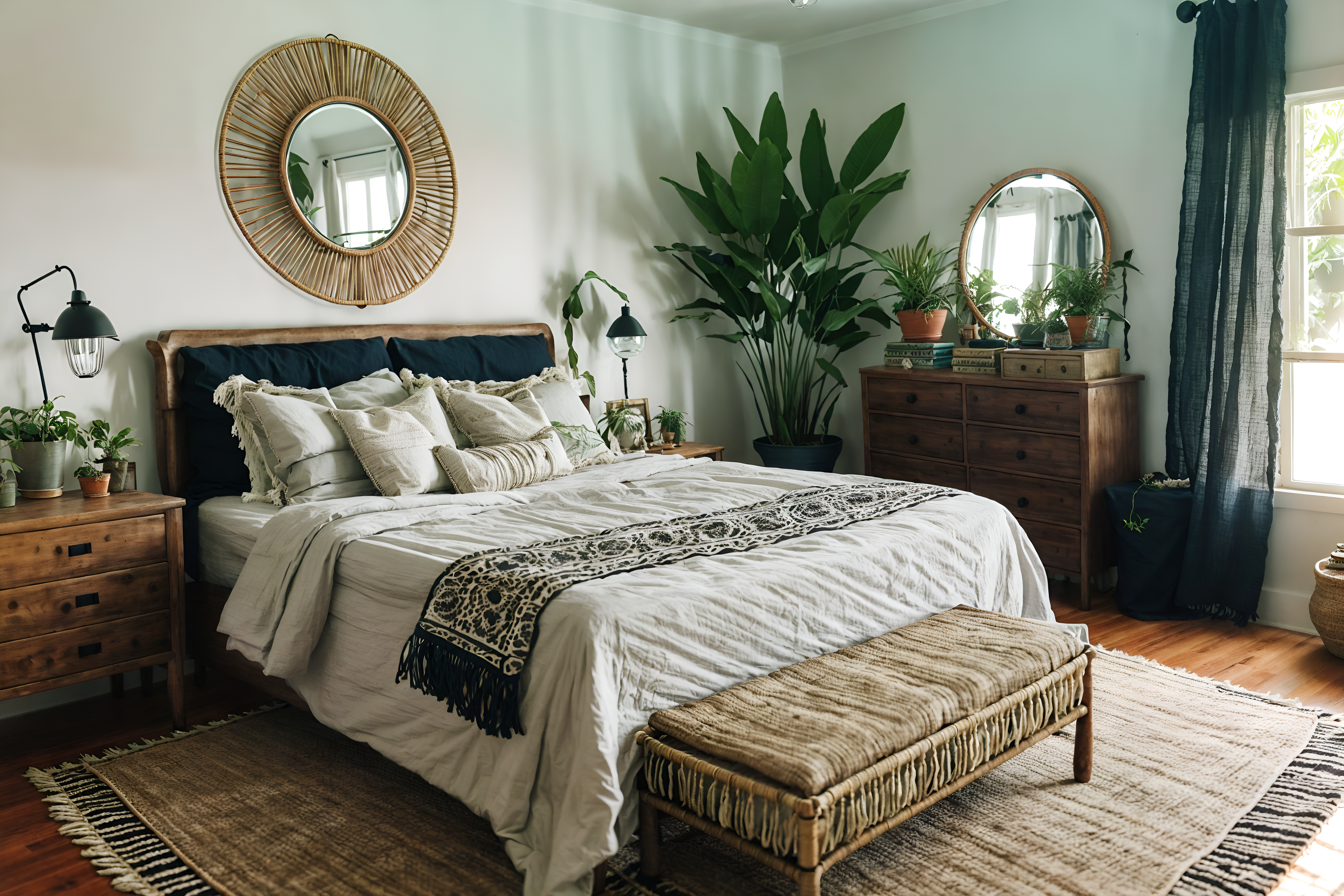 photo from pinterest of boho-chic-style interior designed (bedroom interior) with accent chair and plant and night light and mirror and storage bench or ottoman and headboard and dresser closet and bedside table or night stand cinematic photo, highly detailed, cinematic lighting, ultra-detailed, ultrarealistic, photorealism, 8k. trending on pinterest. boho-chic interior design style. masterpiece, cinematic light, ultrarealistic+, photorealistic+, 8k, raw photo, realistic, sharp focus on eyes, (symmetrical eyes), (intact eyes), hyperrealistic, highest quality, best quality, , highly detailed, masterpiece, best quality, extremely detailed 8k wallpaper, masterpiece, best quality, ultra-detailed, best shadow, detailed background, detailed face, detailed eyes, high contrast, best illumination, detailed face, dulux, caustic, dynamic angle, detailed glow. dramatic lighting. highly detailed, insanely detailed hair, symmetrical, intricate details, professionally retouched, 8k high definition. strong bokeh. award winning photo.