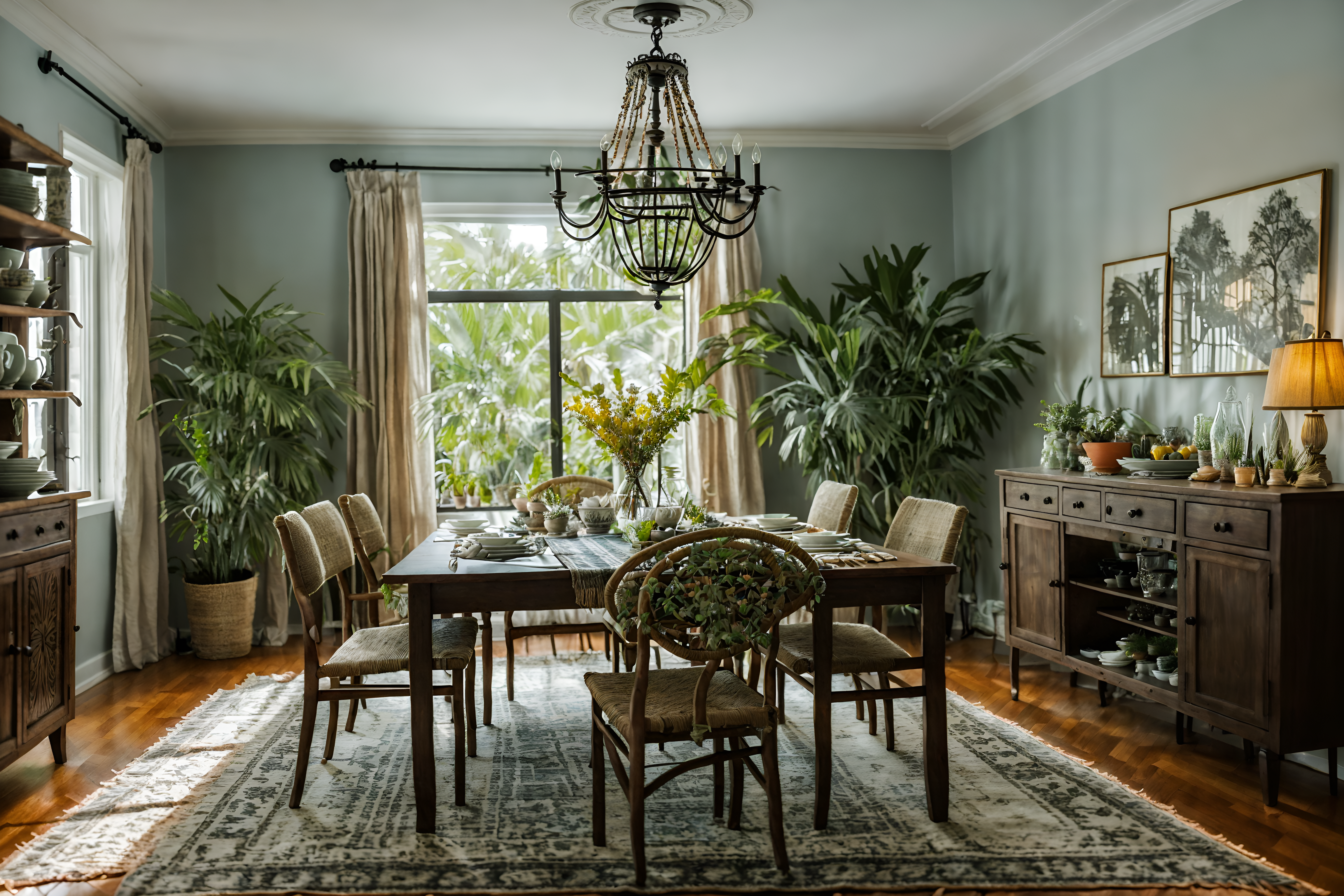 photo from pinterest of boho-chic-style interior designed (dining room interior) with dining table and plant and dining table chairs and painting or photo on wall and bookshelves and plates, cutlery and glasses on dining table and light or chandelier and table cloth cinematic photo, highly detailed, cinematic lighting, ultra-detailed, ultrarealistic, photorealism, 8k. trending on pinterest. boho-chic interior design style. masterpiece, cinematic light, ultrarealistic+, photorealistic+, 8k, raw photo, realistic, sharp focus on eyes, (symmetrical eyes), (intact eyes), hyperrealistic, highest quality, best quality, , highly detailed, masterpiece, best quality, extremely detailed 8k wallpaper, masterpiece, best quality, ultra-detailed, best shadow, detailed background, detailed face, detailed eyes, high contrast, best illumination, detailed face, dulux, caustic, dynamic angle, detailed glow. dramatic lighting. highly detailed, insanely detailed hair, symmetrical, intricate details, professionally retouched, 8k high definition. strong bokeh. award winning photo.