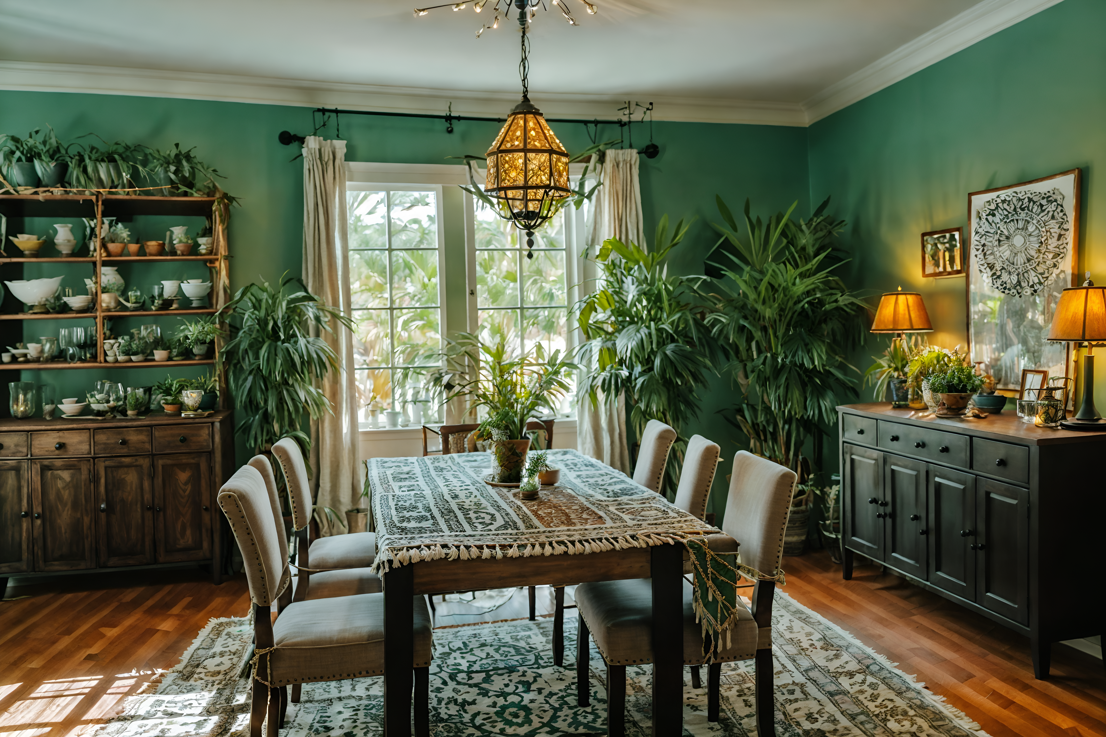 photo from pinterest of boho-chic-style interior designed (dining room interior) with dining table and plant and dining table chairs and painting or photo on wall and bookshelves and plates, cutlery and glasses on dining table and light or chandelier and table cloth cinematic photo, highly detailed, cinematic lighting, ultra-detailed, ultrarealistic, photorealism, 8k. trending on pinterest. boho-chic interior design style. masterpiece, cinematic light, ultrarealistic+, photorealistic+, 8k, raw photo, realistic, sharp focus on eyes, (symmetrical eyes), (intact eyes), hyperrealistic, highest quality, best quality, , highly detailed, masterpiece, best quality, extremely detailed 8k wallpaper, masterpiece, best quality, ultra-detailed, best shadow, detailed background, detailed face, detailed eyes, high contrast, best illumination, detailed face, dulux, caustic, dynamic angle, detailed glow. dramatic lighting. highly detailed, insanely detailed hair, symmetrical, intricate details, professionally retouched, 8k high definition. strong bokeh. award winning photo.