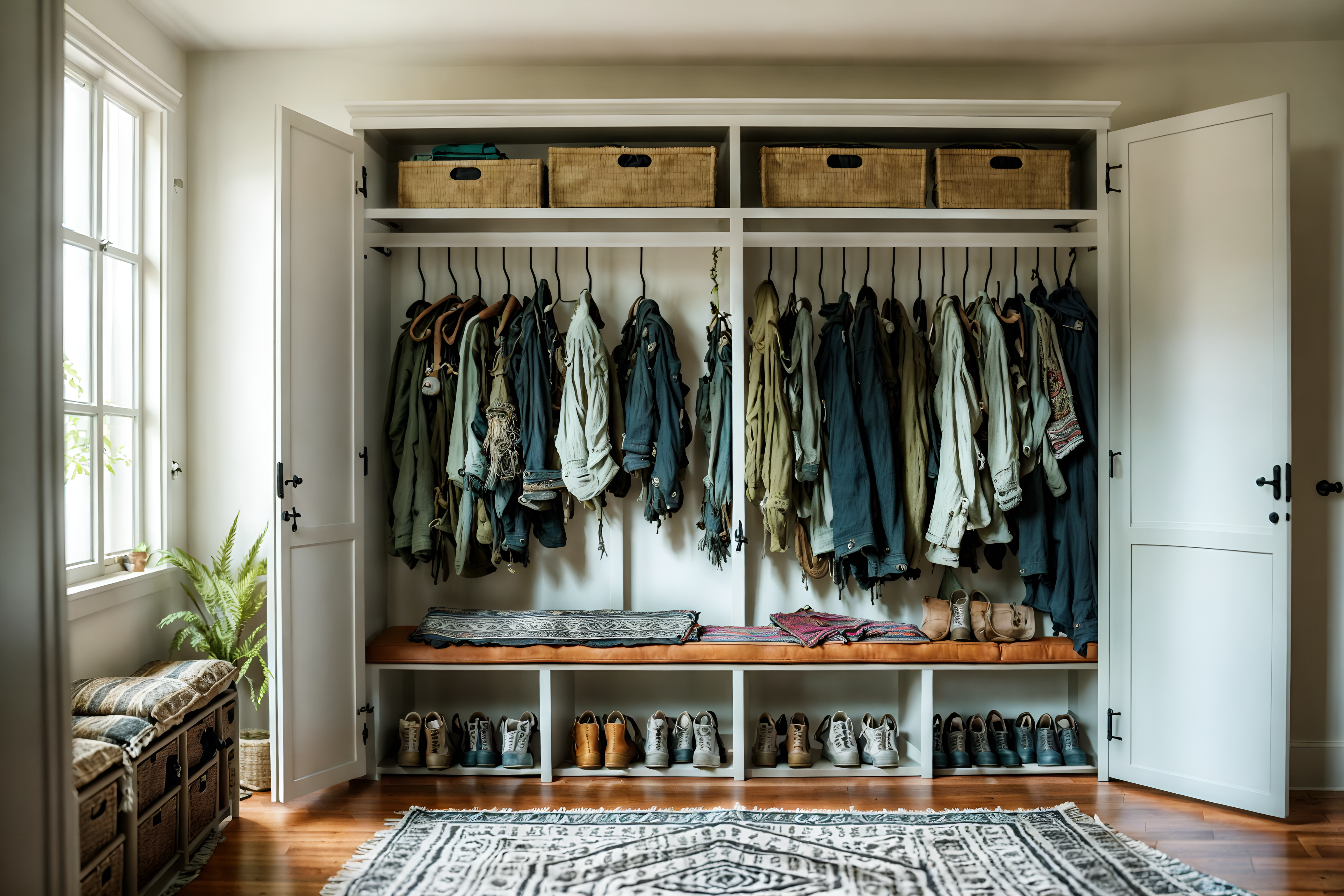 photo from pinterest of boho-chic-style interior designed (drop zone interior) with wall hooks for coats and storage drawers and a bench and storage baskets and high up storage and cabinets and shelves for shoes and lockers cinematic photo, highly detailed, cinematic lighting, ultra-detailed, ultrarealistic, photorealism, 8k. trending on pinterest. boho-chic interior design style. masterpiece, cinematic light, ultrarealistic+, photorealistic+, 8k, raw photo, realistic, sharp focus on eyes, (symmetrical eyes), (intact eyes), hyperrealistic, highest quality, best quality, , highly detailed, masterpiece, best quality, extremely detailed 8k wallpaper, masterpiece, best quality, ultra-detailed, best shadow, detailed background, detailed face, detailed eyes, high contrast, best illumination, detailed face, dulux, caustic, dynamic angle, detailed glow. dramatic lighting. highly detailed, insanely detailed hair, symmetrical, intricate details, professionally retouched, 8k high definition. strong bokeh. award winning photo.