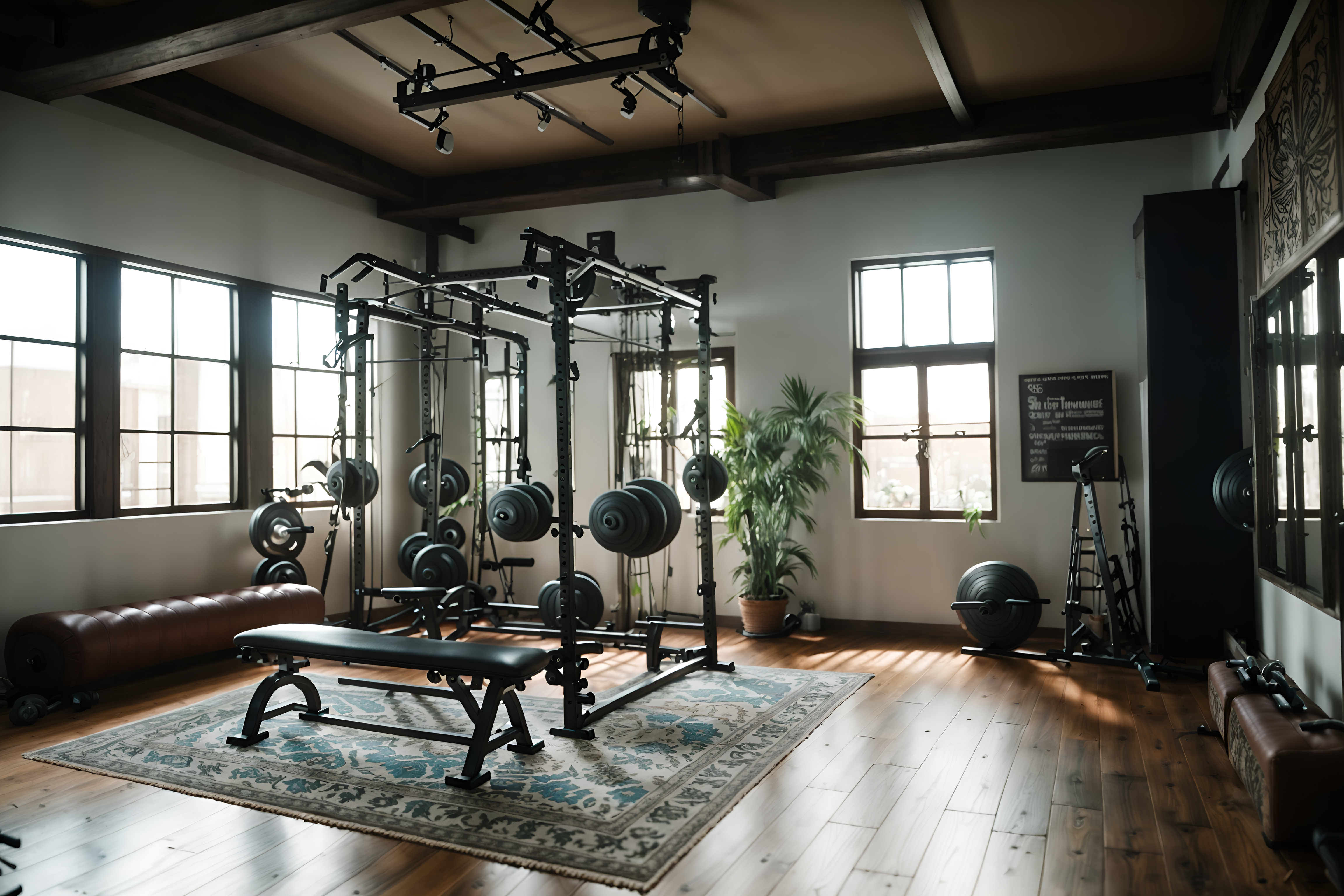 photo from pinterest of boho-chic-style interior designed (fitness gym interior) with exercise bicycle and crosstrainer and bench press and dumbbell stand and squat rack and exercise bicycle cinematic photo, highly detailed, cinematic lighting, ultra-detailed, ultrarealistic, photorealism, 8k. trending on pinterest. boho-chic interior design style. masterpiece, cinematic light, ultrarealistic+, photorealistic+, 8k, raw photo, realistic, sharp focus on eyes, (symmetrical eyes), (intact eyes), hyperrealistic, highest quality, best quality, , highly detailed, masterpiece, best quality, extremely detailed 8k wallpaper, masterpiece, best quality, ultra-detailed, best shadow, detailed background, detailed face, detailed eyes, high contrast, best illumination, detailed face, dulux, caustic, dynamic angle, detailed glow. dramatic lighting. highly detailed, insanely detailed hair, symmetrical, intricate details, professionally retouched, 8k high definition. strong bokeh. award winning photo.