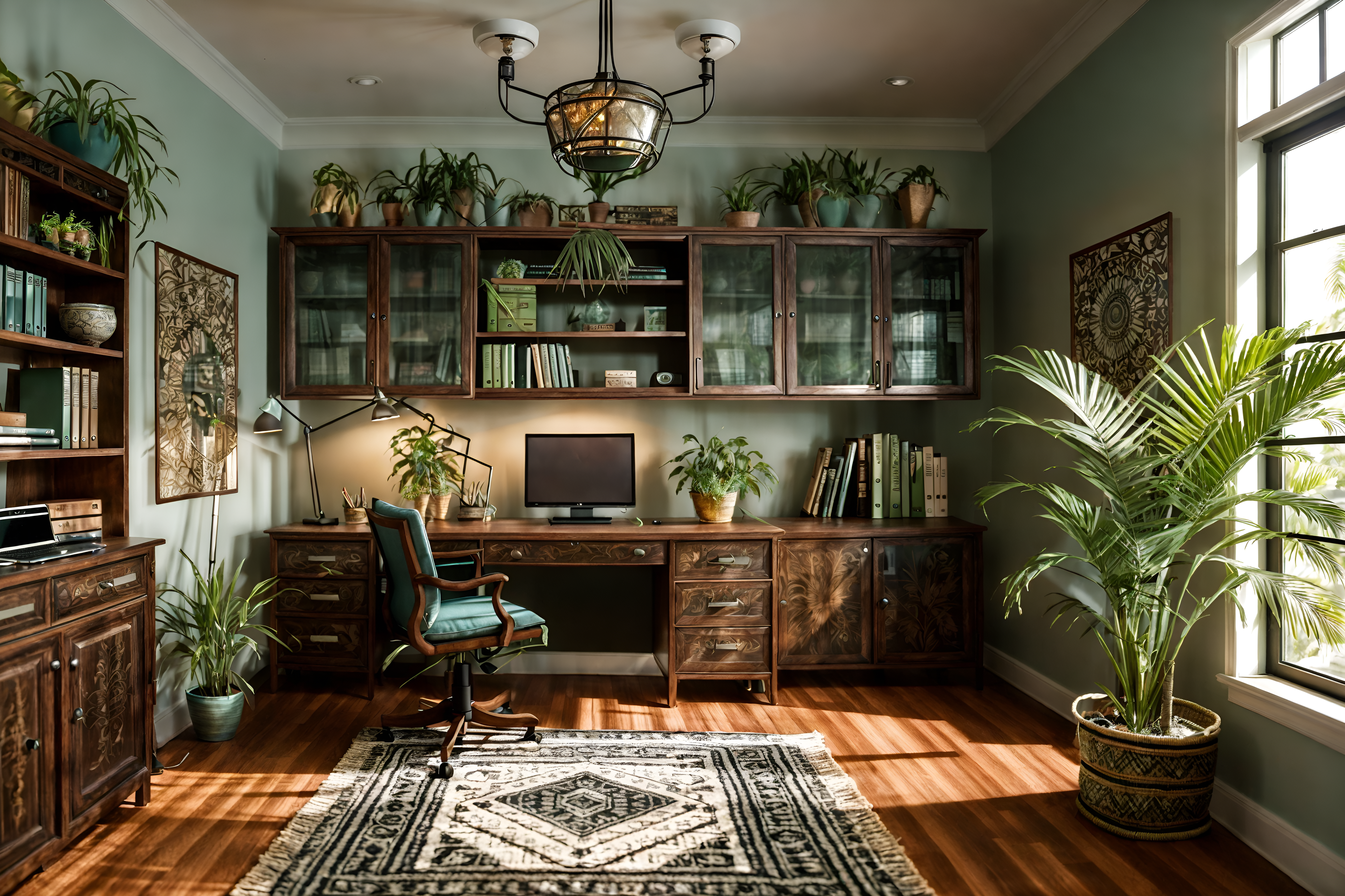 photo from pinterest of boho-chic-style interior designed (home office interior) with cabinets and office chair and plant and computer desk and desk lamp and cabinets cinematic photo, highly detailed, cinematic lighting, ultra-detailed, ultrarealistic, photorealism, 8k. trending on pinterest. boho-chic interior design style. masterpiece, cinematic light, ultrarealistic+, photorealistic+, 8k, raw photo, realistic, sharp focus on eyes, (symmetrical eyes), (intact eyes), hyperrealistic, highest quality, best quality, , highly detailed, masterpiece, best quality, extremely detailed 8k wallpaper, masterpiece, best quality, ultra-detailed, best shadow, detailed background, detailed face, detailed eyes, high contrast, best illumination, detailed face, dulux, caustic, dynamic angle, detailed glow. dramatic lighting. highly detailed, insanely detailed hair, symmetrical, intricate details, professionally retouched, 8k high definition. strong bokeh. award winning photo.