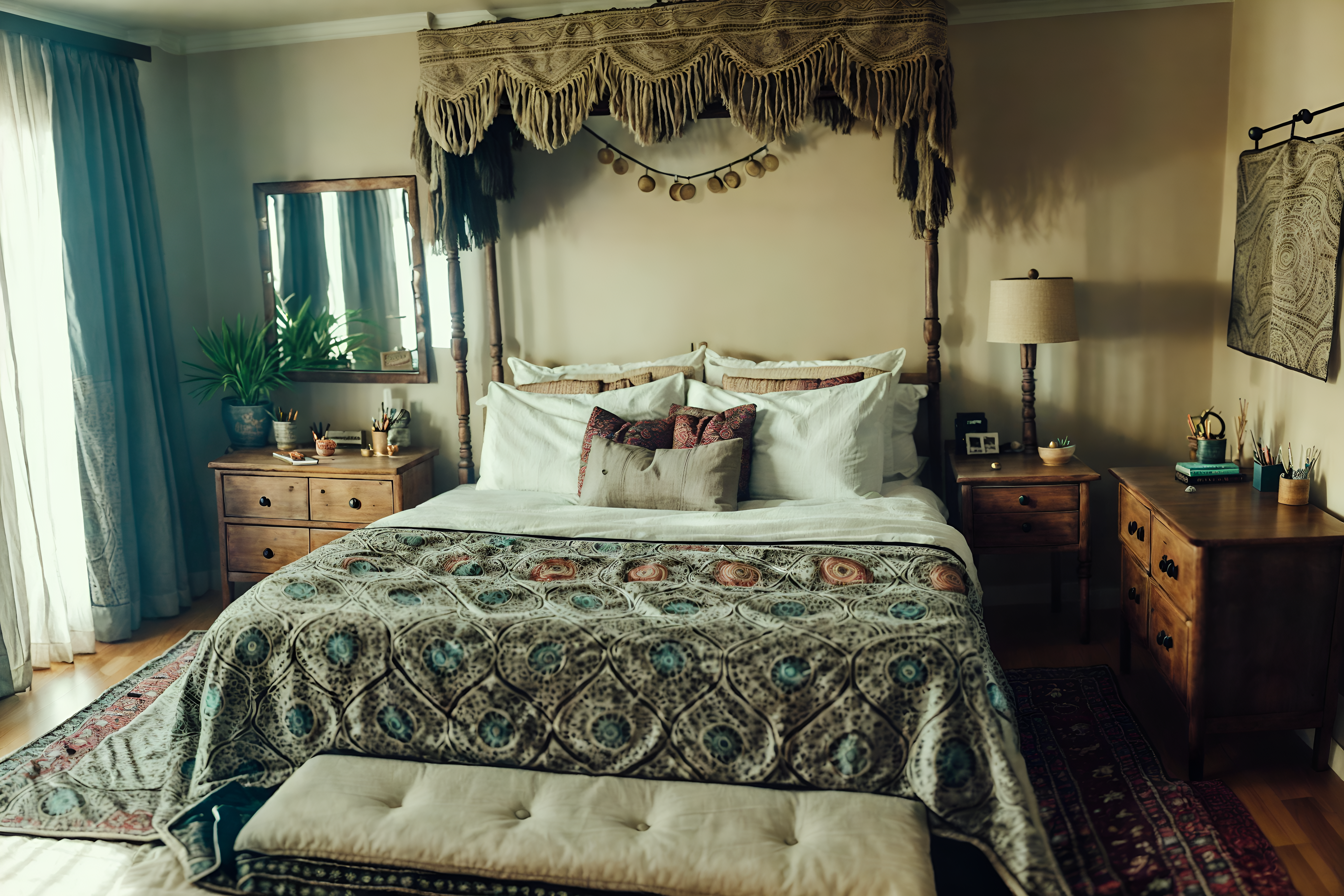 photo from pinterest of boho-chic-style interior designed (hotel room interior) with bed and hotel bathroom and working desk with desk chair and bedside table or night stand and night light and headboard and mirror and storage bench or ottoman cinematic photo, highly detailed, cinematic lighting, ultra-detailed, ultrarealistic, photorealism, 8k. trending on pinterest. boho-chic interior design style. masterpiece, cinematic light, ultrarealistic+, photorealistic+, 8k, raw photo, realistic, sharp focus on eyes, (symmetrical eyes), (intact eyes), hyperrealistic, highest quality, best quality, , highly detailed, masterpiece, best quality, extremely detailed 8k wallpaper, masterpiece, best quality, ultra-detailed, best shadow, detailed background, detailed face, detailed eyes, high contrast, best illumination, detailed face, dulux, caustic, dynamic angle, detailed glow. dramatic lighting. highly detailed, insanely detailed hair, symmetrical, intricate details, professionally retouched, 8k high definition. strong bokeh. award winning photo.