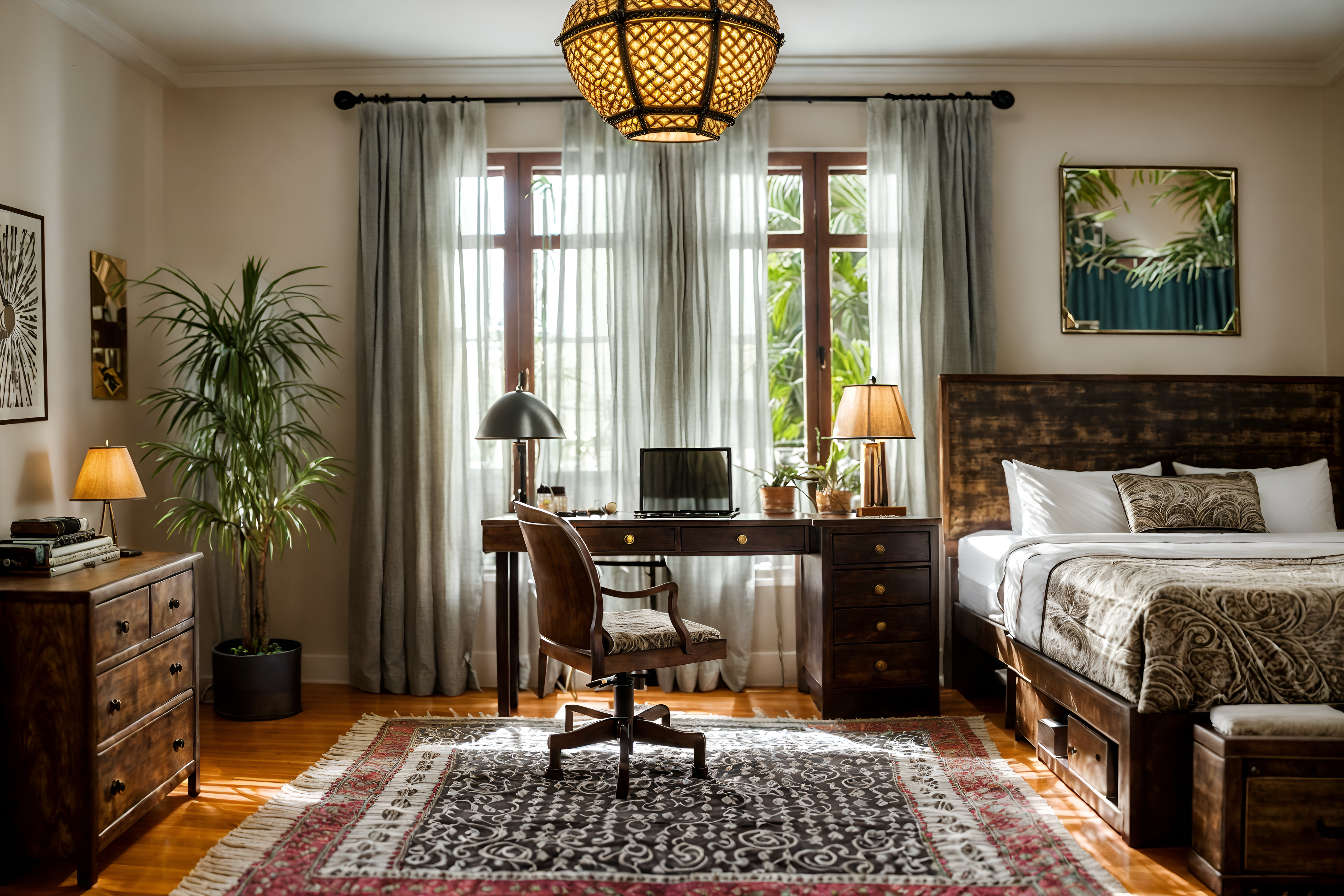 photo from pinterest of boho-chic-style interior designed (hotel room interior) with bed and hotel bathroom and working desk with desk chair and bedside table or night stand and night light and headboard and mirror and storage bench or ottoman cinematic photo, highly detailed, cinematic lighting, ultra-detailed, ultrarealistic, photorealism, 8k. trending on pinterest. boho-chic interior design style. masterpiece, cinematic light, ultrarealistic+, photorealistic+, 8k, raw photo, realistic, sharp focus on eyes, (symmetrical eyes), (intact eyes), hyperrealistic, highest quality, best quality, , highly detailed, masterpiece, best quality, extremely detailed 8k wallpaper, masterpiece, best quality, ultra-detailed, best shadow, detailed background, detailed face, detailed eyes, high contrast, best illumination, detailed face, dulux, caustic, dynamic angle, detailed glow. dramatic lighting. highly detailed, insanely detailed hair, symmetrical, intricate details, professionally retouched, 8k high definition. strong bokeh. award winning photo.