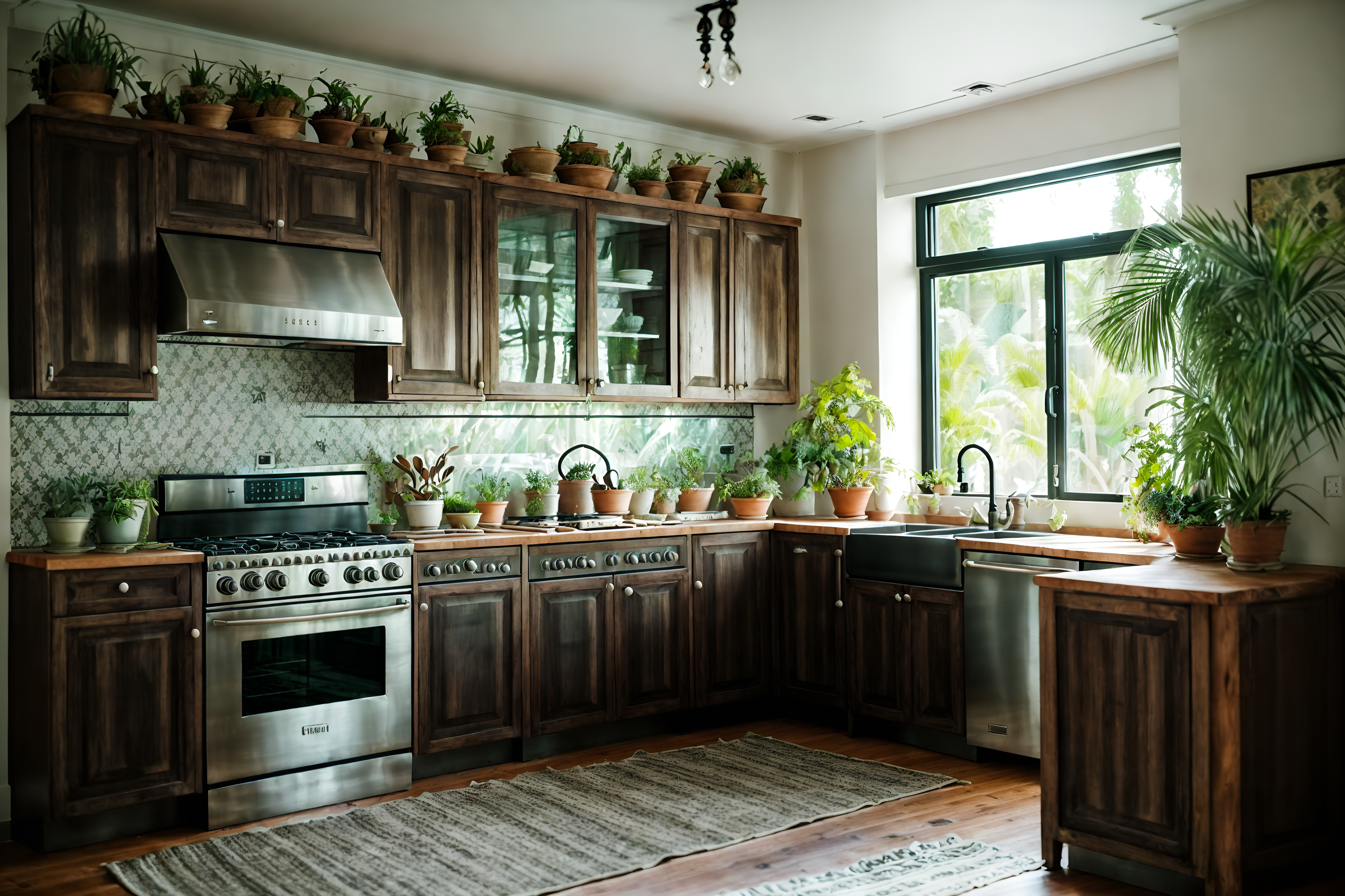 photo from pinterest of boho-chic-style interior designed (kitchen interior) with worktops and stove and kitchen cabinets and plant and sink and refrigerator and worktops cinematic photo, highly detailed, cinematic lighting, ultra-detailed, ultrarealistic, photorealism, 8k. trending on pinterest. boho-chic interior design style. masterpiece, cinematic light, ultrarealistic+, photorealistic+, 8k, raw photo, realistic, sharp focus on eyes, (symmetrical eyes), (intact eyes), hyperrealistic, highest quality, best quality, , highly detailed, masterpiece, best quality, extremely detailed 8k wallpaper, masterpiece, best quality, ultra-detailed, best shadow, detailed background, detailed face, detailed eyes, high contrast, best illumination, detailed face, dulux, caustic, dynamic angle, detailed glow. dramatic lighting. highly detailed, insanely detailed hair, symmetrical, intricate details, professionally retouched, 8k high definition. strong bokeh. award winning photo.