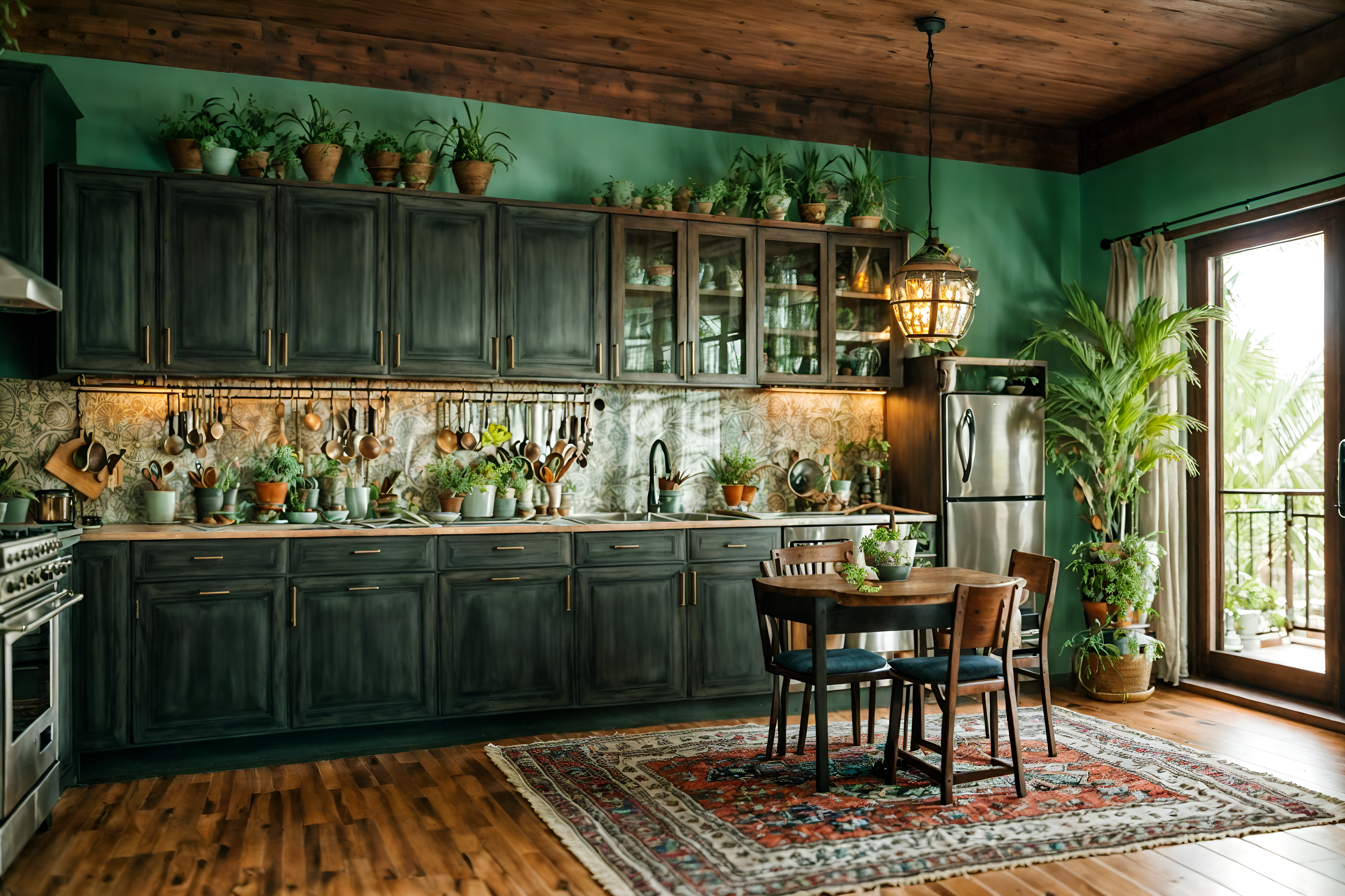 photo from pinterest of boho-chic-style interior designed (kitchen living combo interior) with sink and occasional tables and rug and televisions and electric lamps and chairs and refrigerator and plant cinematic photo, highly detailed, cinematic lighting, ultra-detailed, ultrarealistic, photorealism, 8k. trending on pinterest. boho-chic interior design style. masterpiece, cinematic light, ultrarealistic+, photorealistic+, 8k, raw photo, realistic, sharp focus on eyes, (symmetrical eyes), (intact eyes), hyperrealistic, highest quality, best quality, , highly detailed, masterpiece, best quality, extremely detailed 8k wallpaper, masterpiece, best quality, ultra-detailed, best shadow, detailed background, detailed face, detailed eyes, high contrast, best illumination, detailed face, dulux, caustic, dynamic angle, detailed glow. dramatic lighting. highly detailed, insanely detailed hair, symmetrical, intricate details, professionally retouched, 8k high definition. strong bokeh. award winning photo.