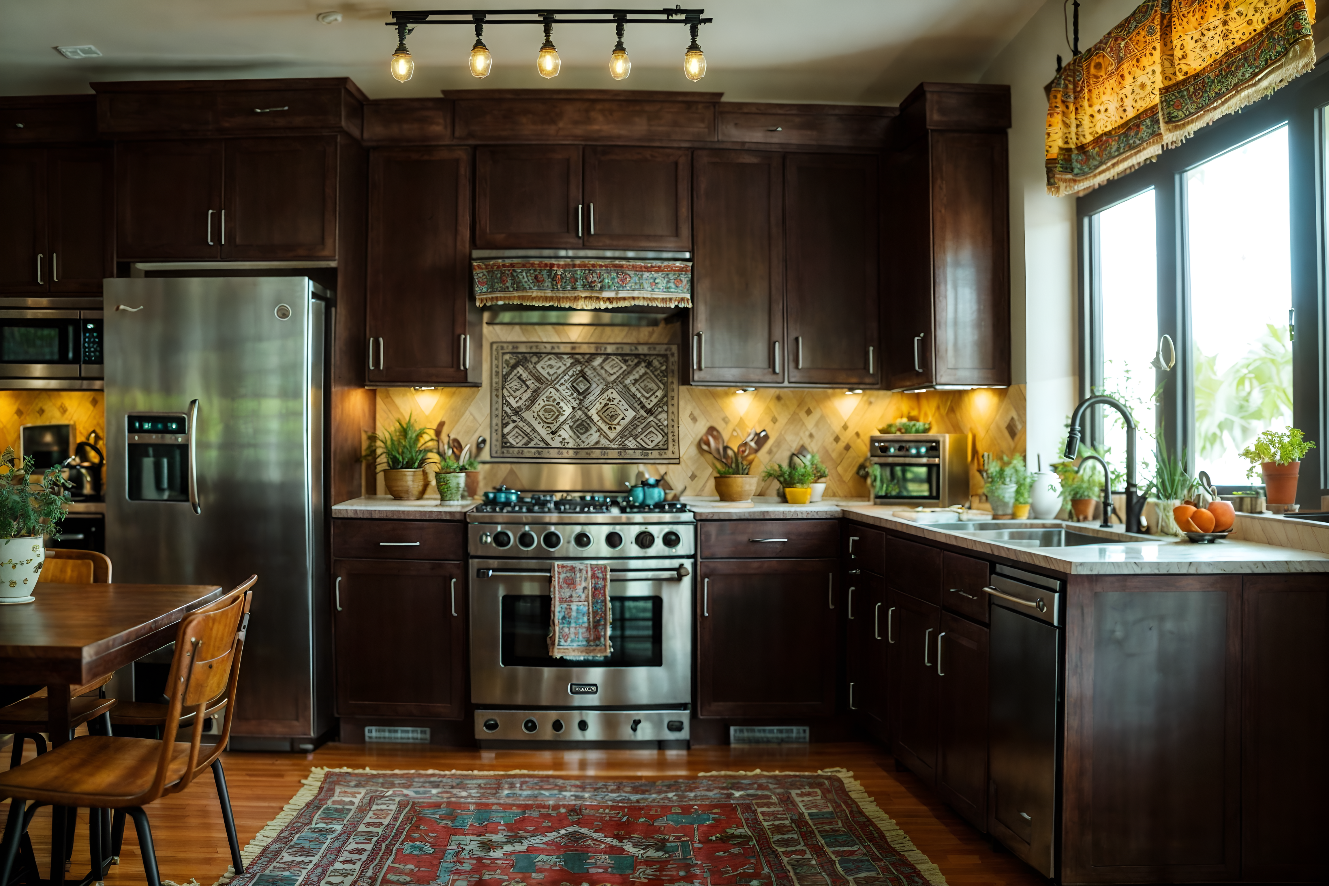 photo from pinterest of boho-chic-style interior designed (kitchen living combo interior) with sink and occasional tables and rug and televisions and electric lamps and chairs and refrigerator and plant cinematic photo, highly detailed, cinematic lighting, ultra-detailed, ultrarealistic, photorealism, 8k. trending on pinterest. boho-chic interior design style. masterpiece, cinematic light, ultrarealistic+, photorealistic+, 8k, raw photo, realistic, sharp focus on eyes, (symmetrical eyes), (intact eyes), hyperrealistic, highest quality, best quality, , highly detailed, masterpiece, best quality, extremely detailed 8k wallpaper, masterpiece, best quality, ultra-detailed, best shadow, detailed background, detailed face, detailed eyes, high contrast, best illumination, detailed face, dulux, caustic, dynamic angle, detailed glow. dramatic lighting. highly detailed, insanely detailed hair, symmetrical, intricate details, professionally retouched, 8k high definition. strong bokeh. award winning photo.