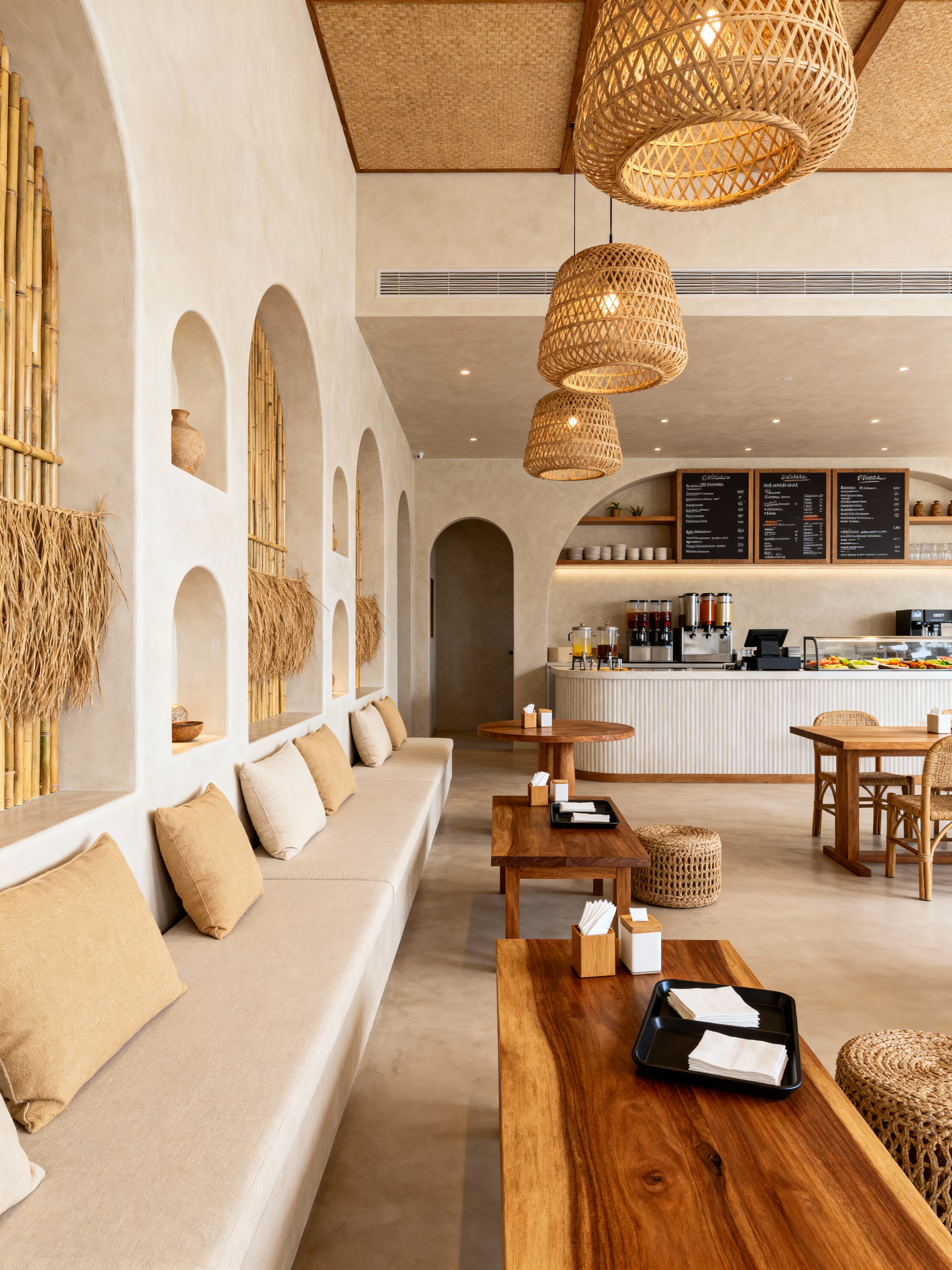cafeteria with bali style with benches and chairs and trays and napkin dispensers and dining tables and food service counter and beverage station and menu boards. . with modern boho chic and beige and sand tone cushions and wooden coffee and dining tables and woven pendant lamps and calm, minimal, tropical atmosphere and raffia or bamboo accents and arched walls and niches and neutral color palette