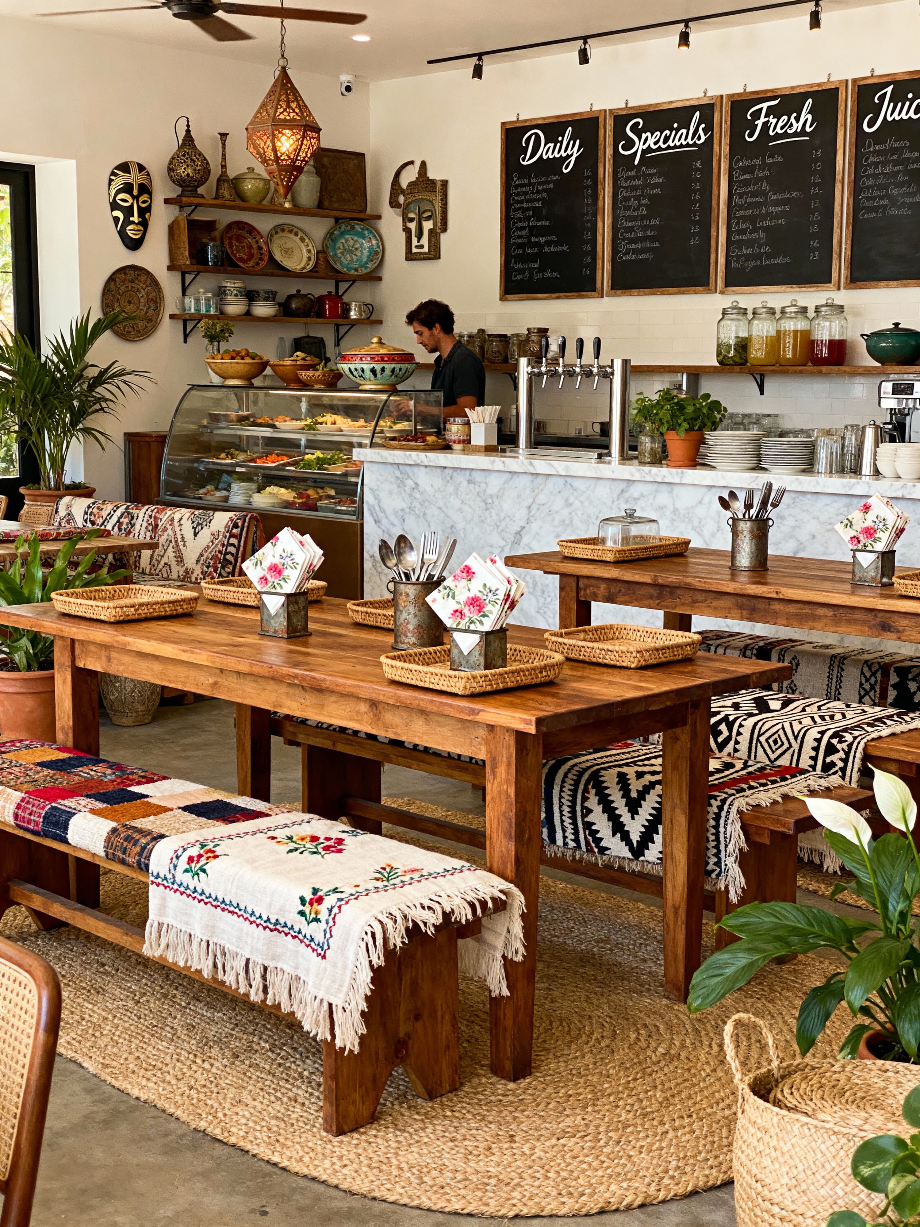 cafeteria with boho-chic style with dining tables and trays and food service counter and benches and menu boards and utensils and napkin dispensers and beverage station. . with natural materials and free-spirited and eclectic mix and layered textiles and vintage finds and global artifacts and relaxed atmosphere and mixed patterns
