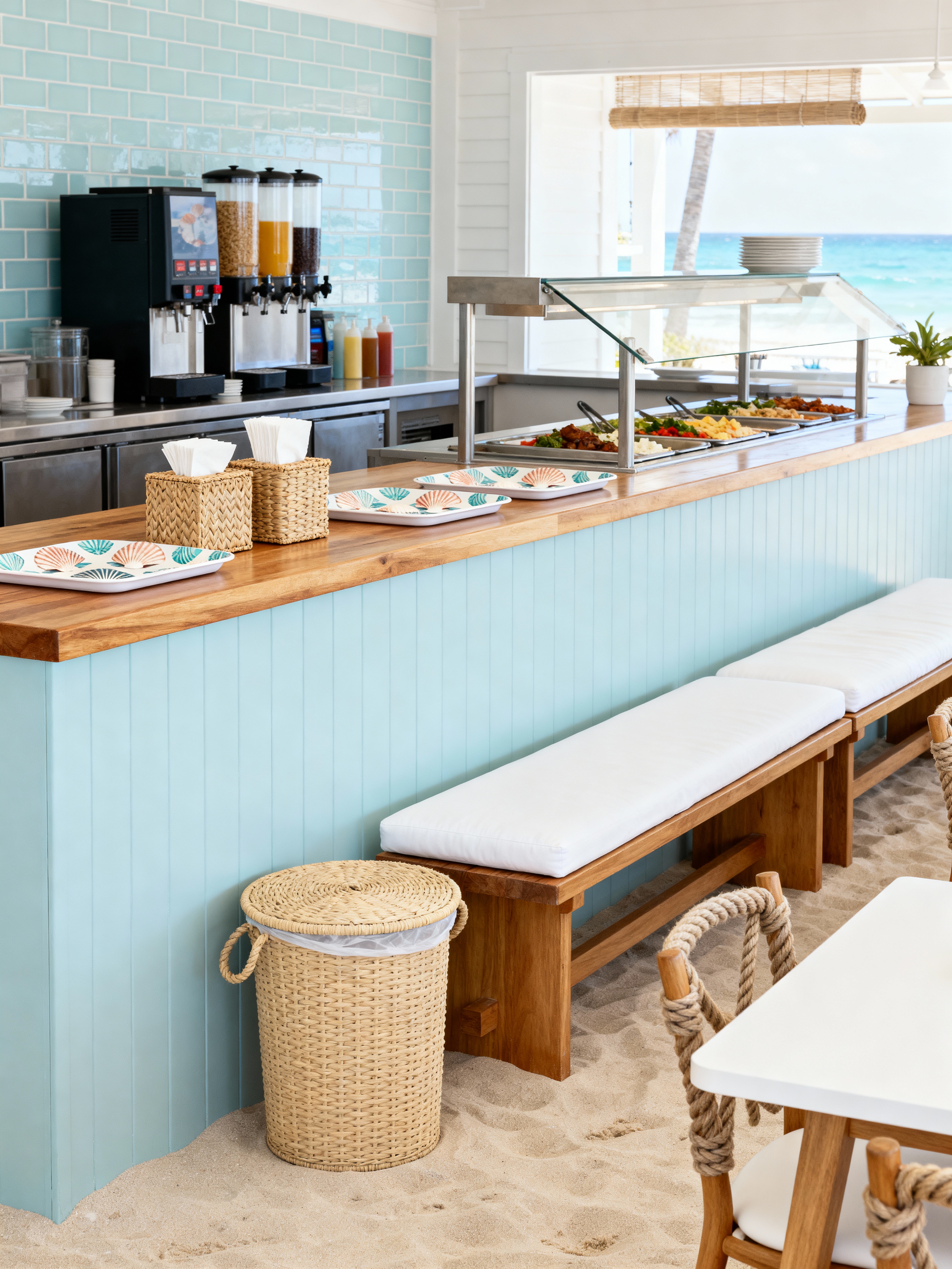 cafeteria with coastal style with beverage station and trash bins and benches and food service counter and napkin dispensers and trays and chairs and dining tables. . with airy feel and natural materials and white decor and beach vibes and sand tones and nautical decor and relaxed style and ocean-inspired