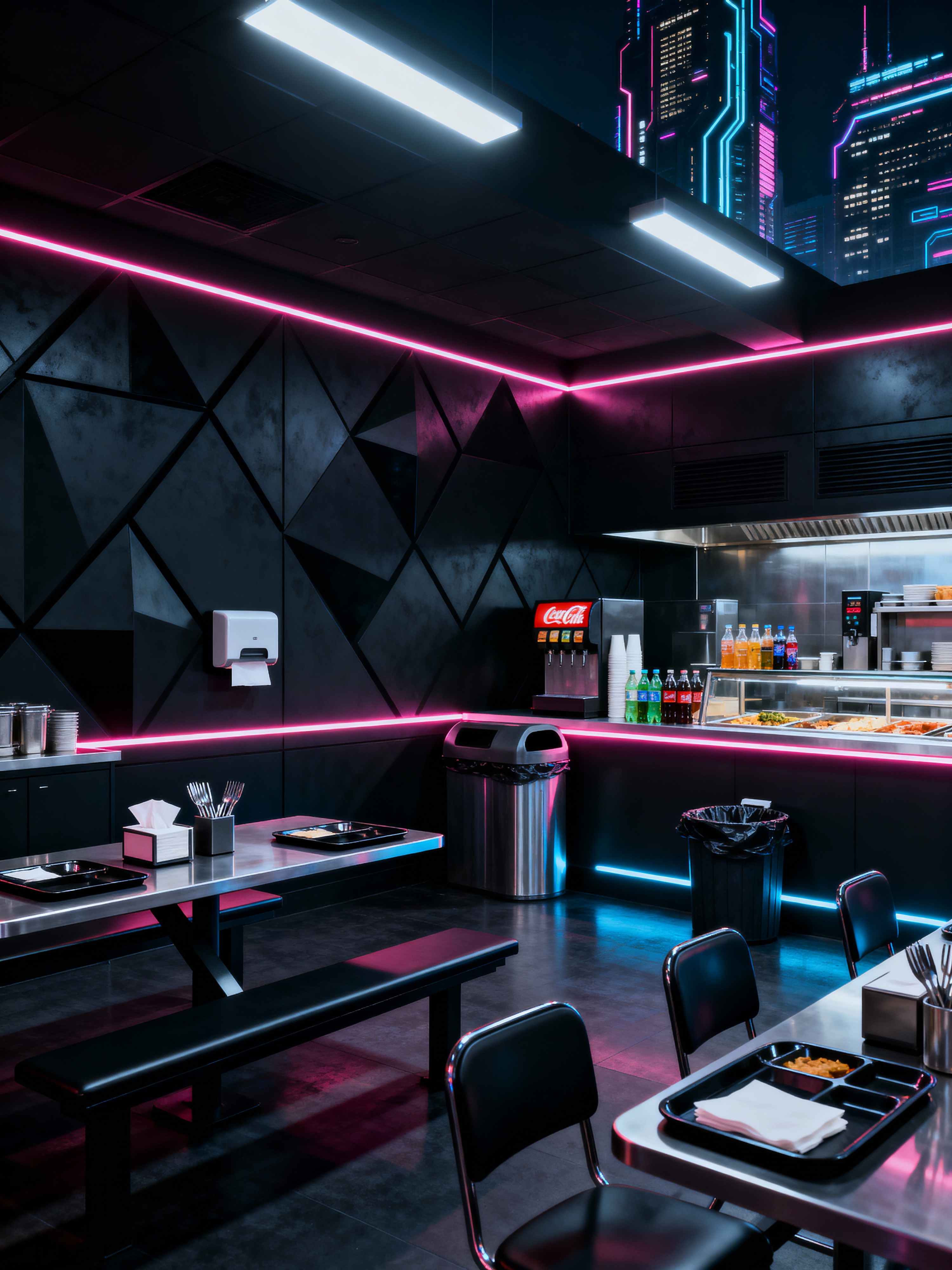 cafeteria with cyberpunk style with trays and napkin dispensers and benches and utensils and beverage station and chairs and food service counter and trash bins. . with black lights and strong geometric walls and futuristic cybernetic city and led lights and dark night and bladerunner lights and bladerunner style and cyberpunk style
