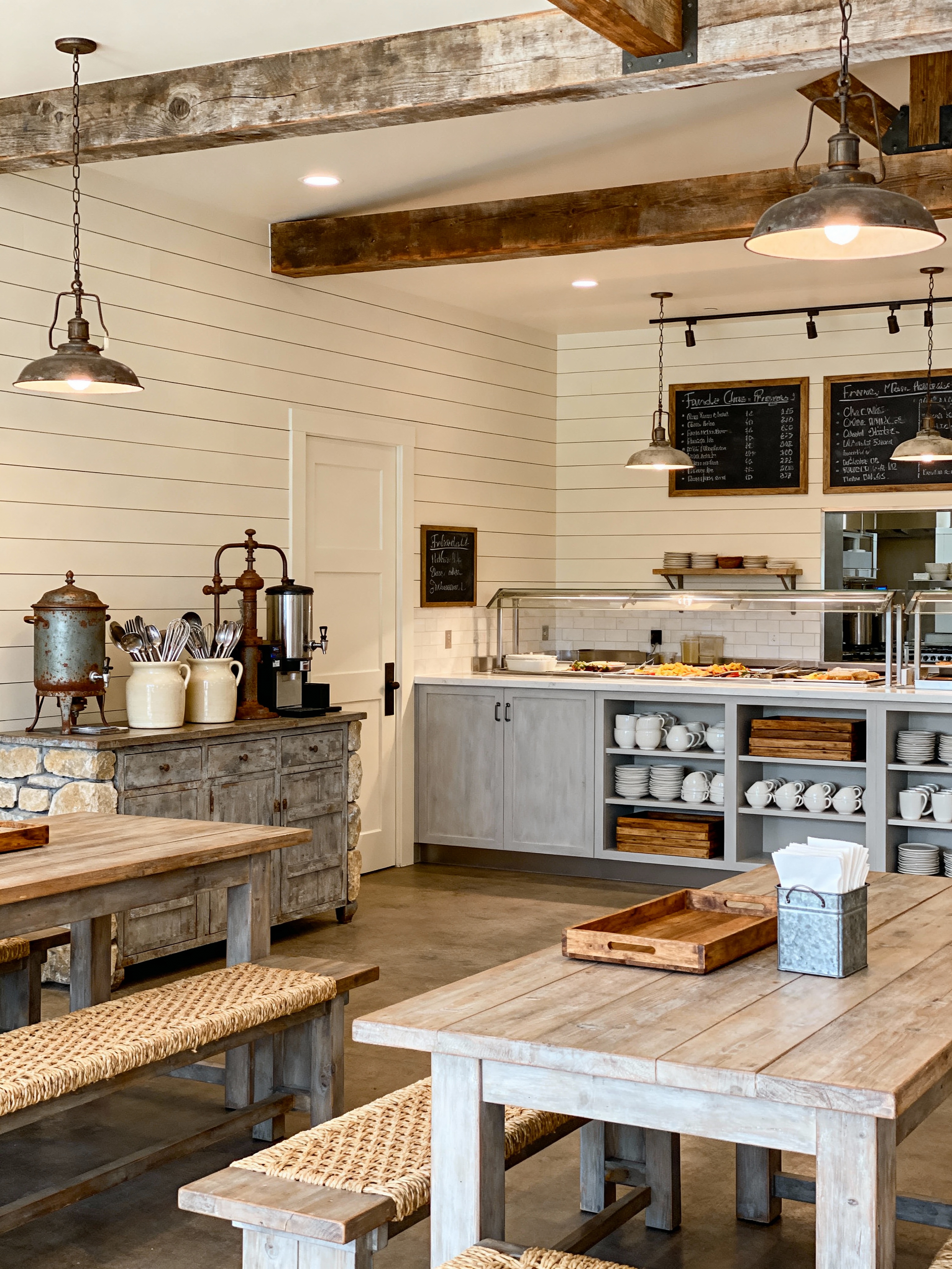 cafeteria with farmhouse style with beverage station and utensils and benches and dining tables and napkin dispensers and menu boards and trays and food service counter. . with industrial accents and vintage decor and neutral tones and open shelving and country style and natural textures and shiplap walls and exposed wood