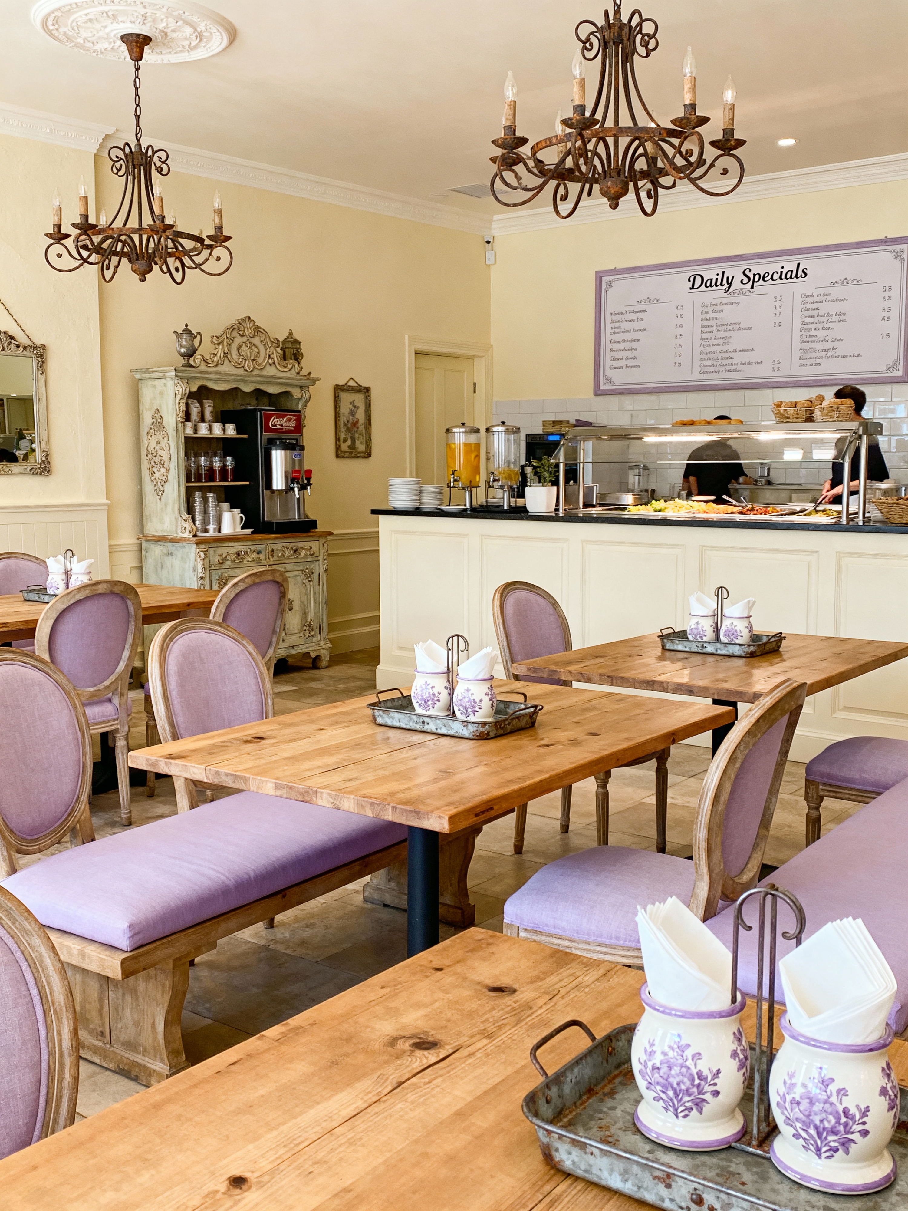 cafeteria with french country style with chairs and beverage station and dining tables and napkin dispensers and menu boards and food service counter and benches and trays. . with soft fabrics and lavender accents and antique decor and country elegance and chandeliers and elegant rustic and vintage furniture and warm tones