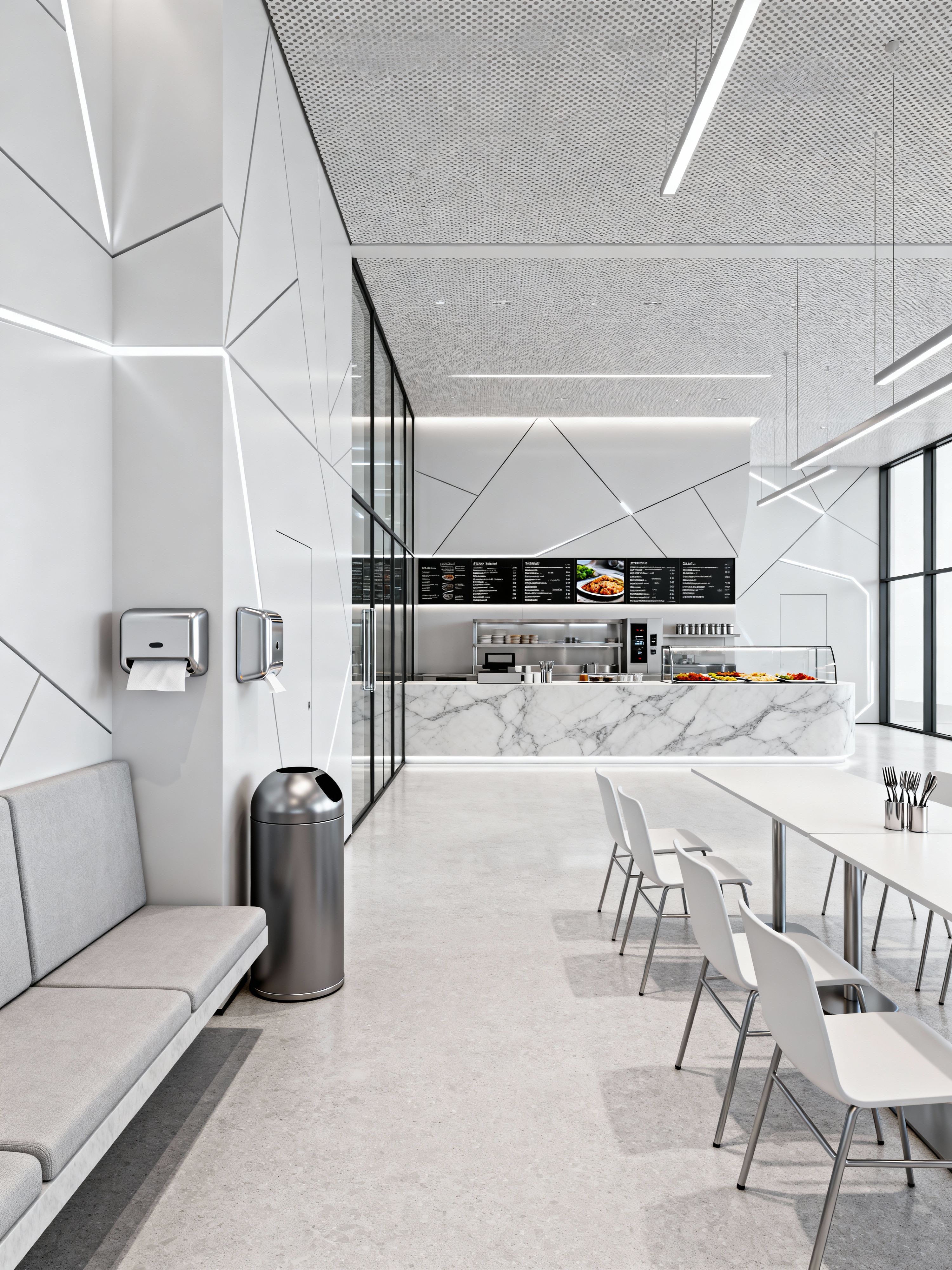 cafeteria with futuristic style with utensils and chairs and napkin dispensers and trash bins and menu boards and benches and food service counter and dining tables. . with light colors and futuristic interior and monochromatic palette and futurism minimalist interior and neutral background and bright accents and smooth marble and strong geometric walls and glass panes