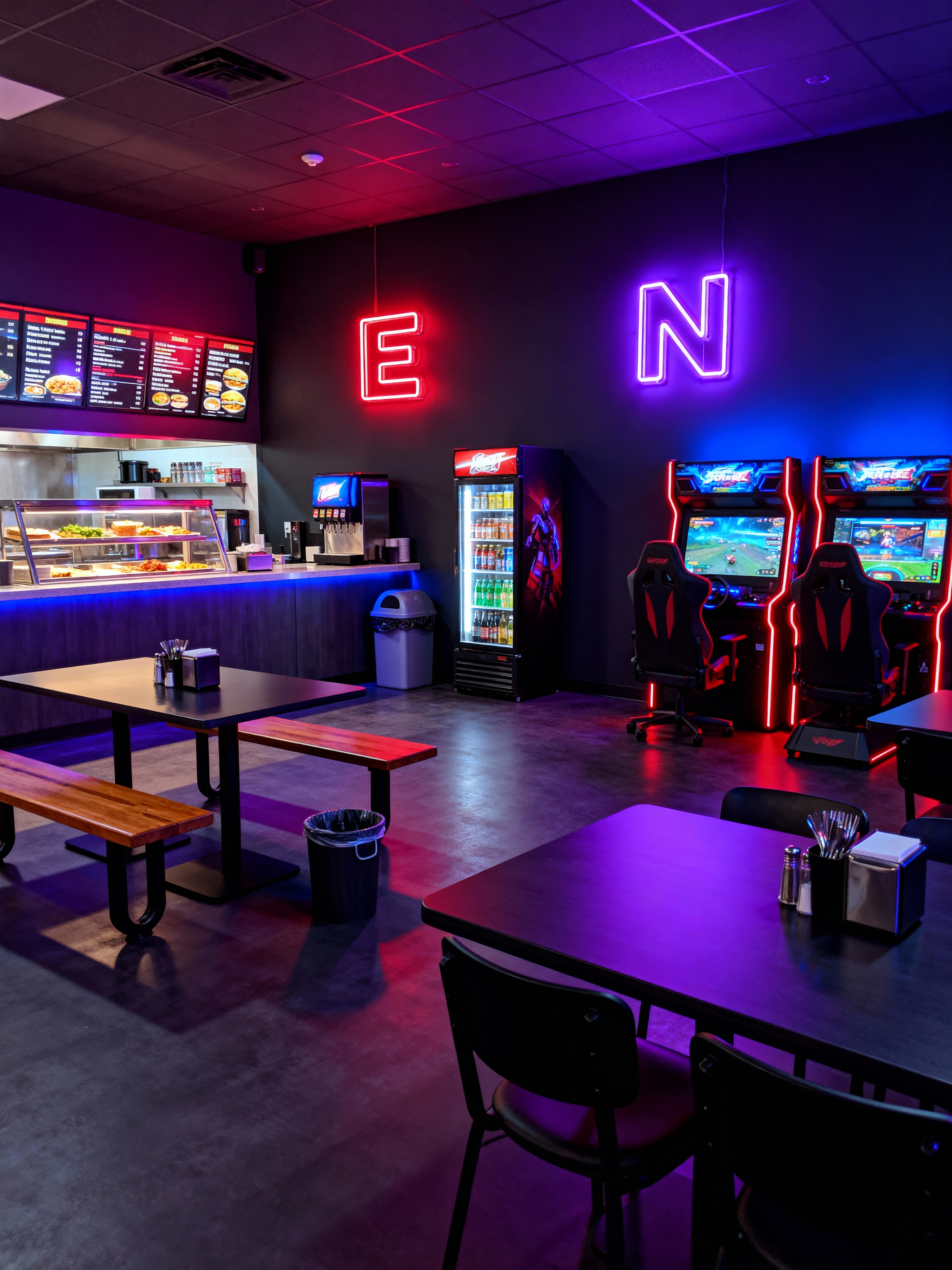 cafeteria with gaming room style with food service counter and menu boards and benches and dining tables and trash bins and utensils and chairs and beverage station. . with at night and neon letters on wall and purple, red and blue fade light and purple and red lights and video game consoles and gaming chair and dark room and dark walls
