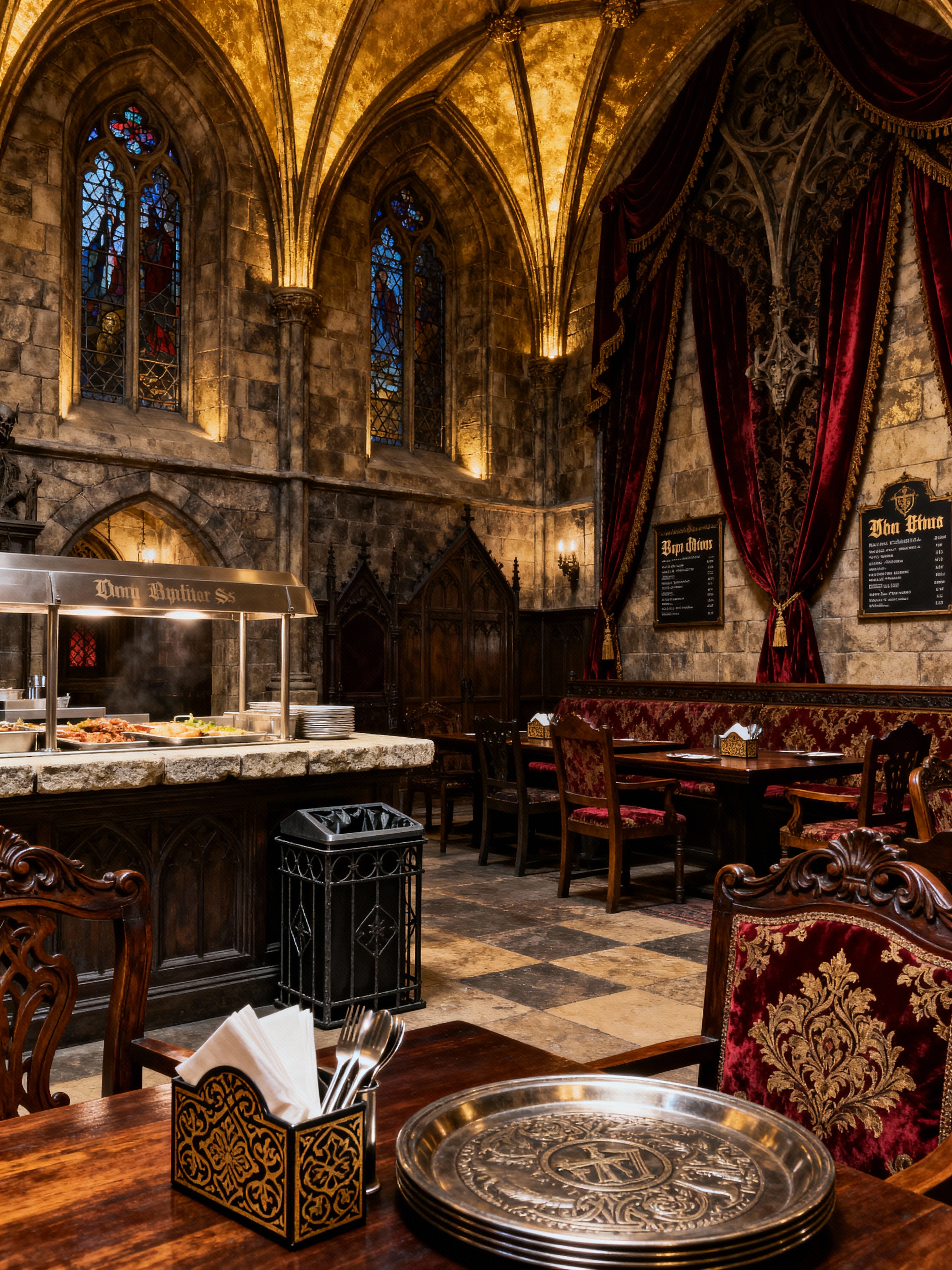 cafeteria with gothic style with dining tables and utensils and napkin dispensers and food service counter and trash bins and chairs and menu boards and trays. . with ornate details and arched windows and rich fabrics and cathedral style and medieval influence and heavy furniture and stone textures and mysterious mood