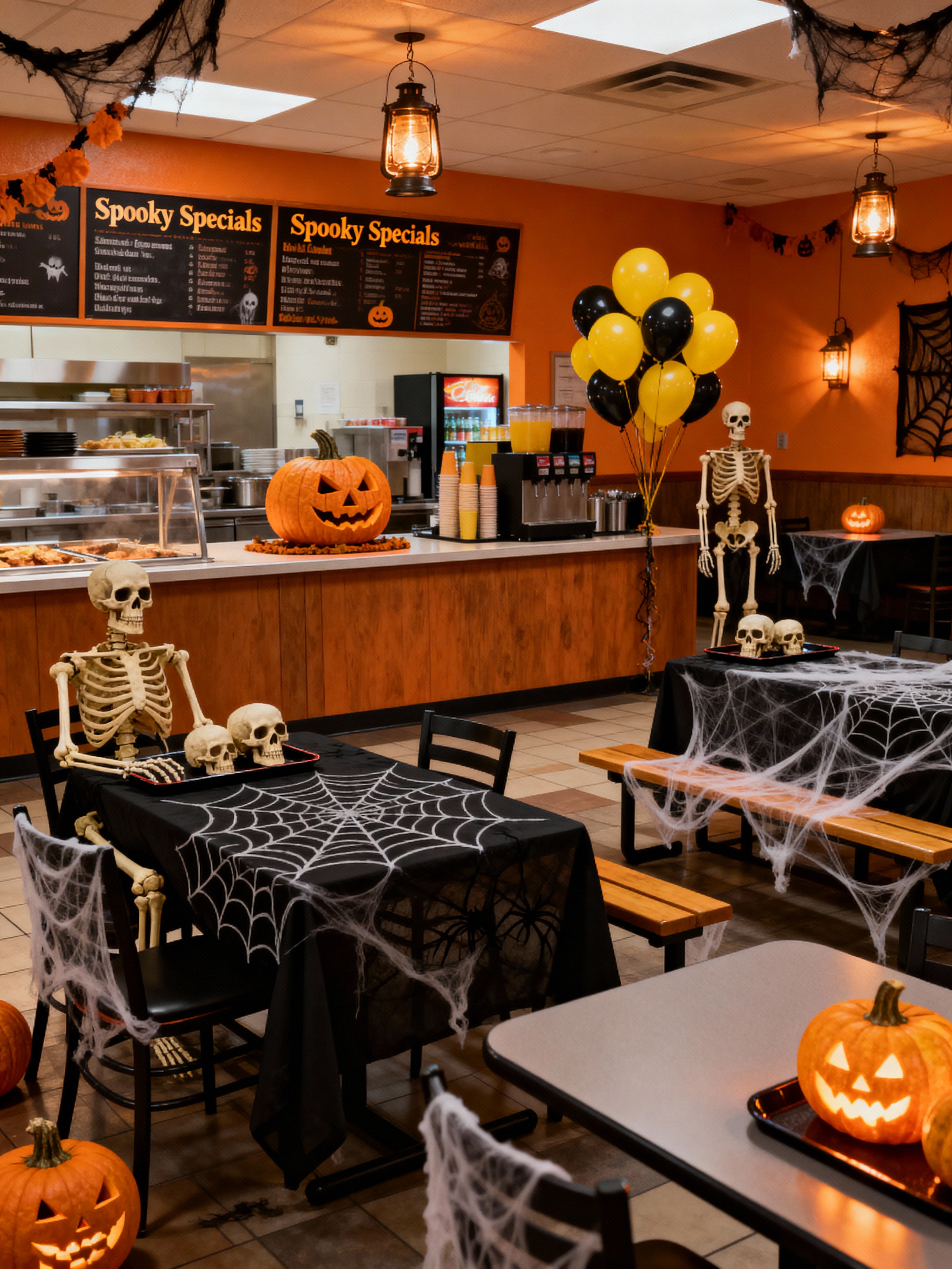 cafeteria with halloween style with utensils and food service counter and beverage station and menu boards and chairs and trays and benches and dining tables. . with skeletons sitting and standing and spiderwebs and lanterns and cobwebs and yellow black balloons and lanterns and human skulls and glowing pumpkins