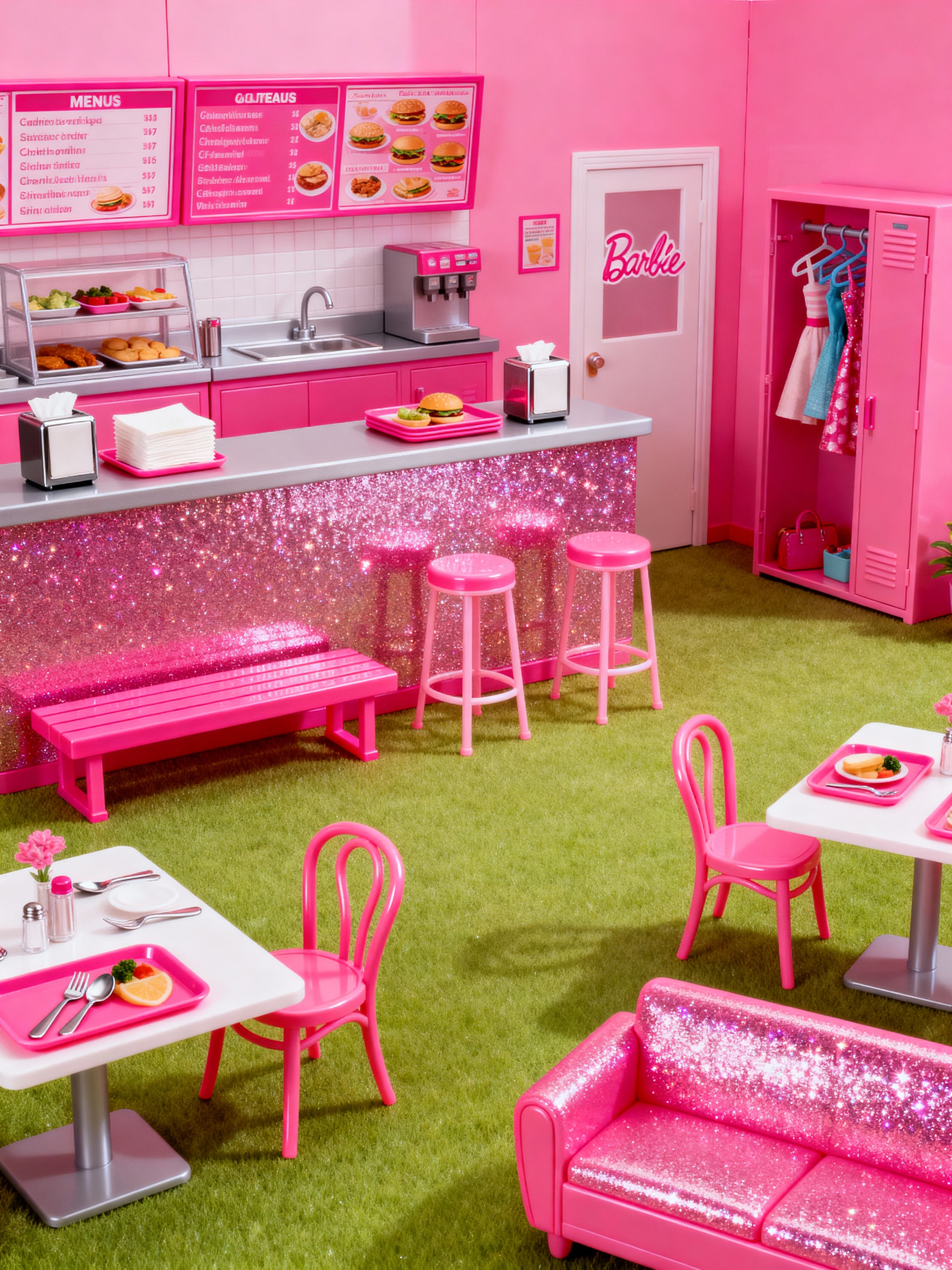 cafeteria with hot pink style with menu boards and food service counter and chairs and benches and napkin dispensers and trays and dining tables and utensils. . with barbie plastic interior and barbie sofa and barbie closet and hot pink barbie walls and barbie style interior and barbie glitter and sparkle and barbie chairs and hot pink barbie colors