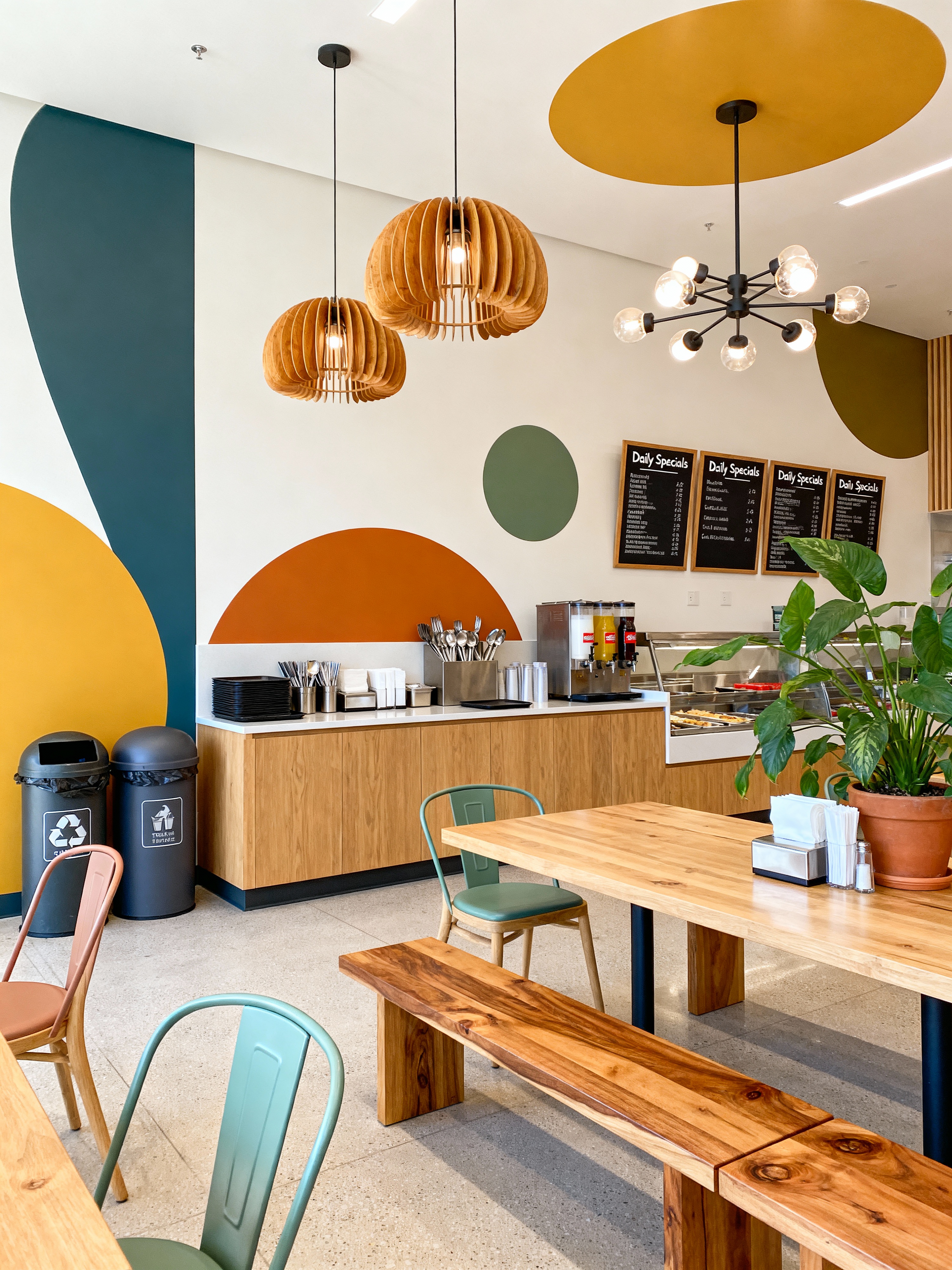 cafeteria with midcentury modern style with trash bins and utensils and chairs and benches and napkin dispensers and beverage station and trays and menu boards. . with minimalist and integrating indoor and outdoor motifs and wood pendant light mid century modern chandelier and vibrant colors and graphic shapes and clean lines and organic and geometric shapes and nature indoors