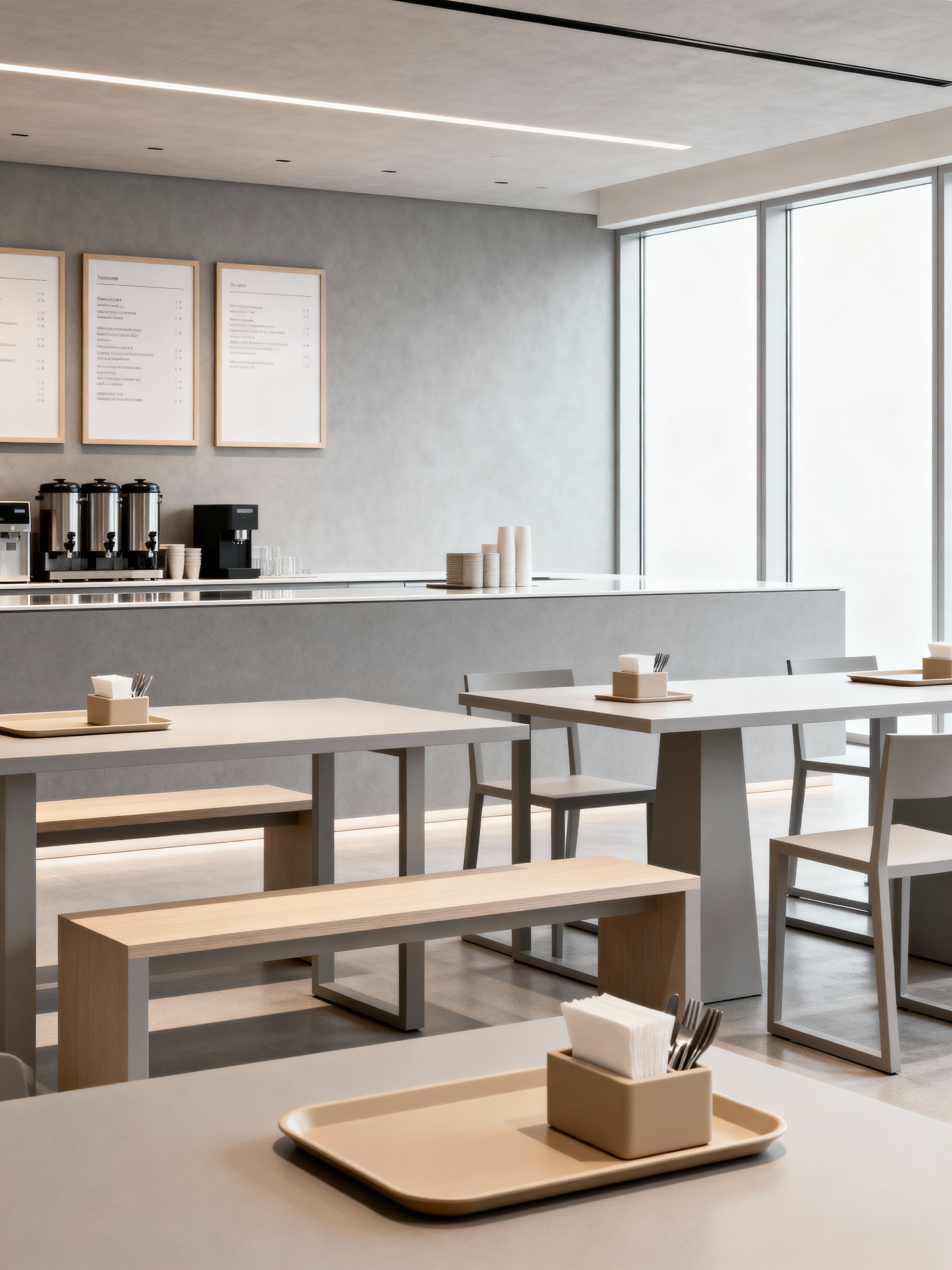 cafeteria with minimalist style with menu boards and beverage station and dining tables and trays and benches and napkin dispensers and utensils and chairs. . with an open floor plan and focus on the shape, colour and texture of just a few of essential elements and a monochromatic palette with colour used as an accent and clean lines and functional furniture and lots of light and an open floor plan