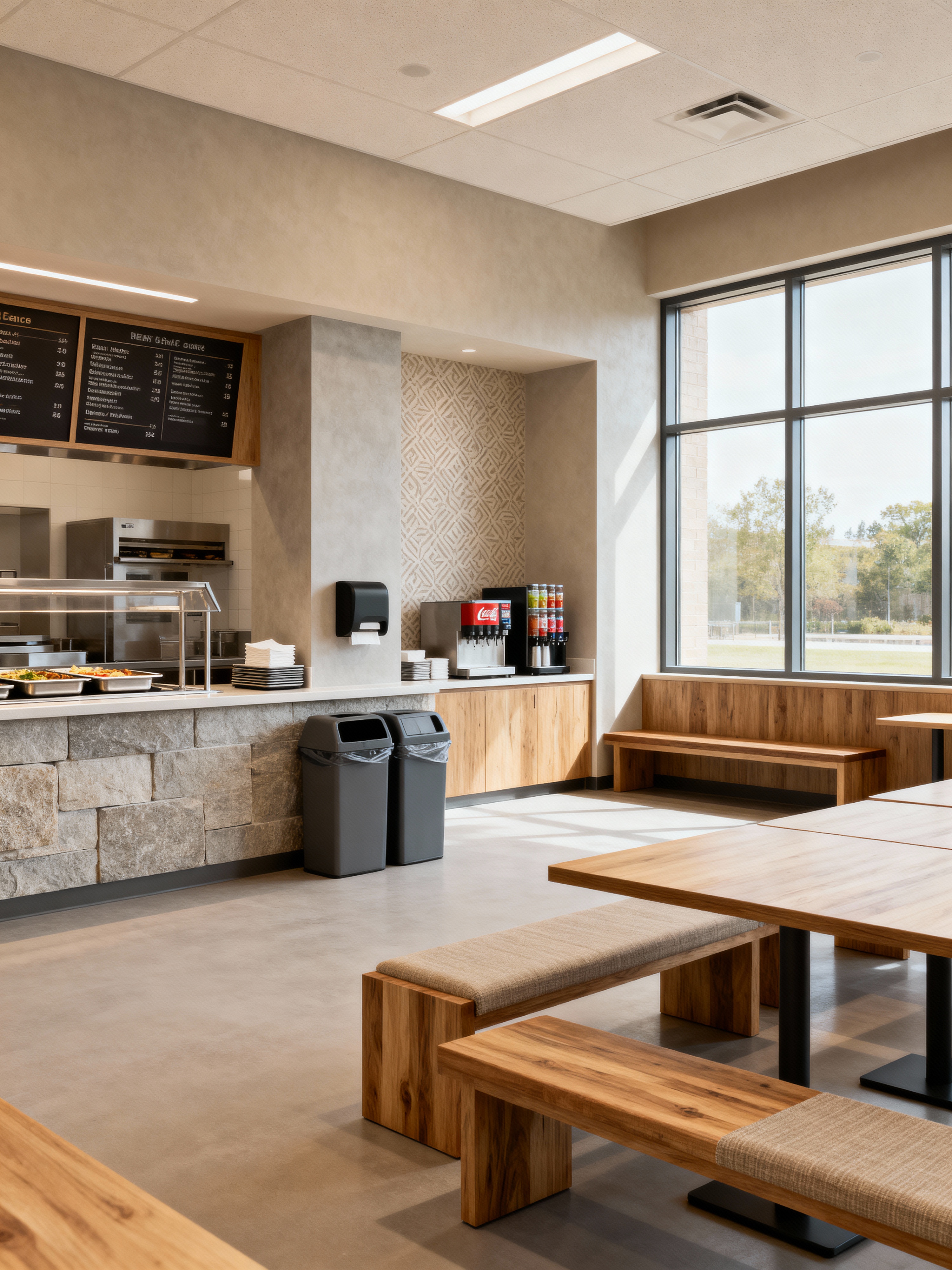 cafeteria with modern style with trays and menu boards and napkin dispensers and benches and beverage station and dining tables and food service counter and trash bins. . with natural materials and elements and simple, clean lines and simplistic furniture and practicality and functionality and open and natural lighting and neutral walls and textures and natural materials and elements