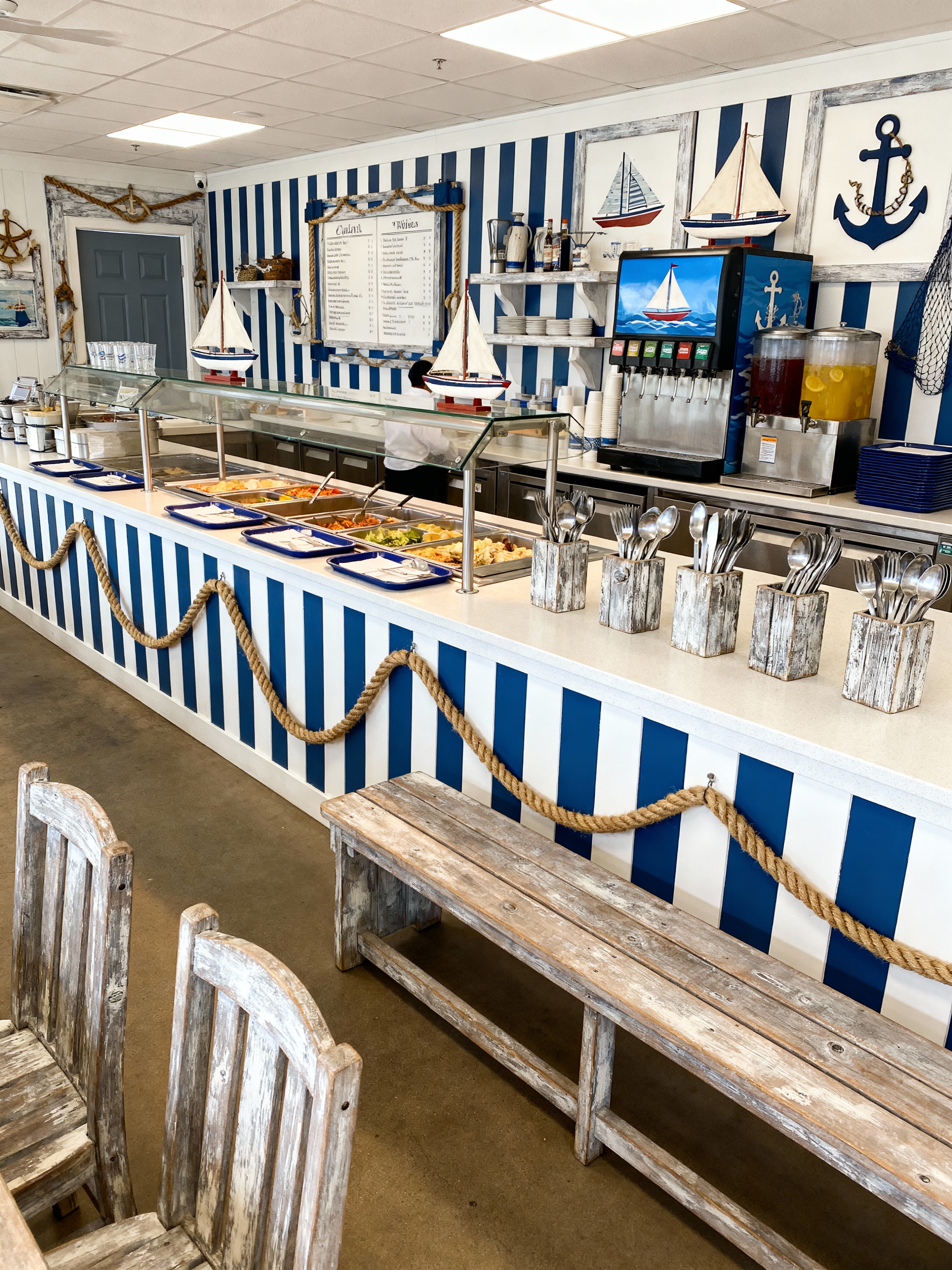 cafeteria with nautical style with trash bins and chairs and trays and food service counter and benches and beverage station and menu boards and utensils. . with weathered wood and striped patterns and seaside charm and rope details and sailboat elements and maritime decor and coastal vibes and anchor motifs