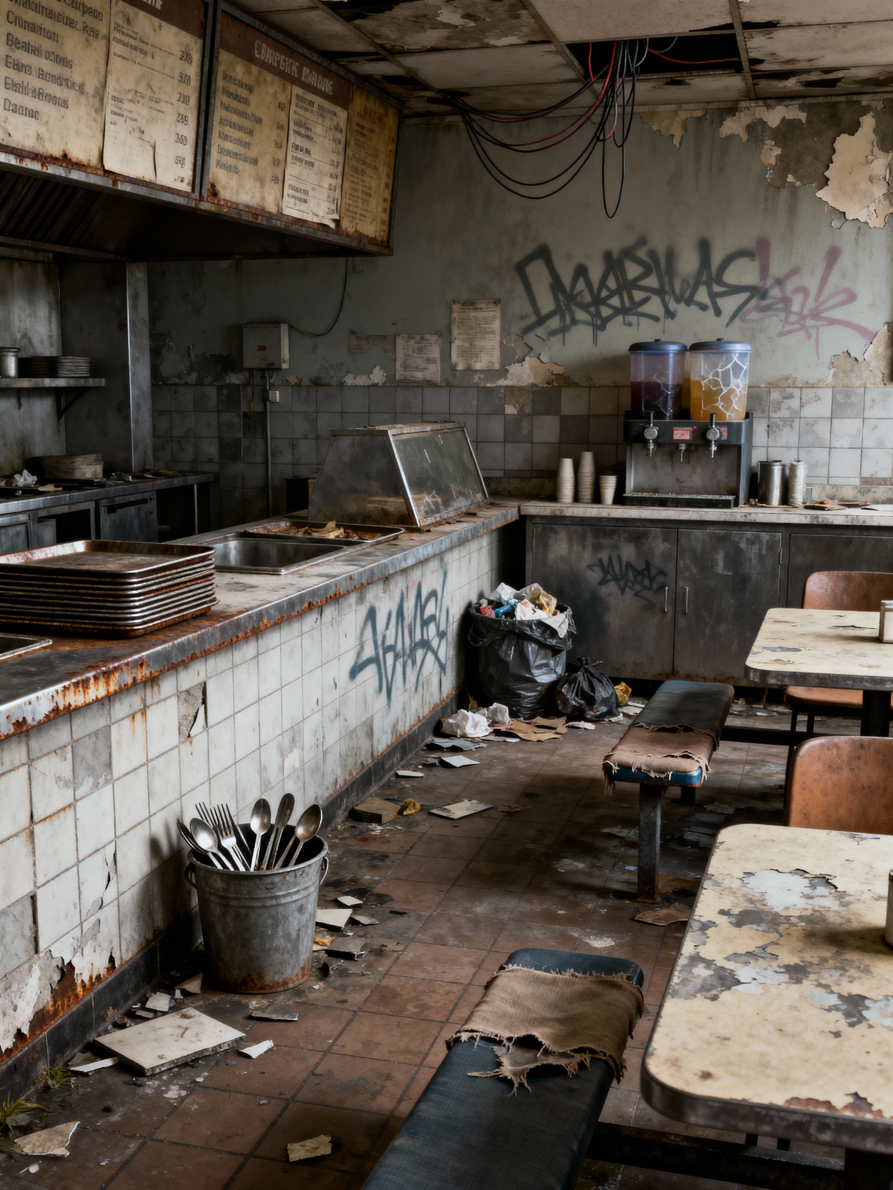 cafeteria with post-apocalyptic style with food service counter and trays and benches and utensils and dining tables and trash bins and menu boards and beverage station. . with broken tiles and desolate and urbex and hanging exposed wires and peeling paint and survival-inspired and graffiti on walls and cheap mismatched furniture