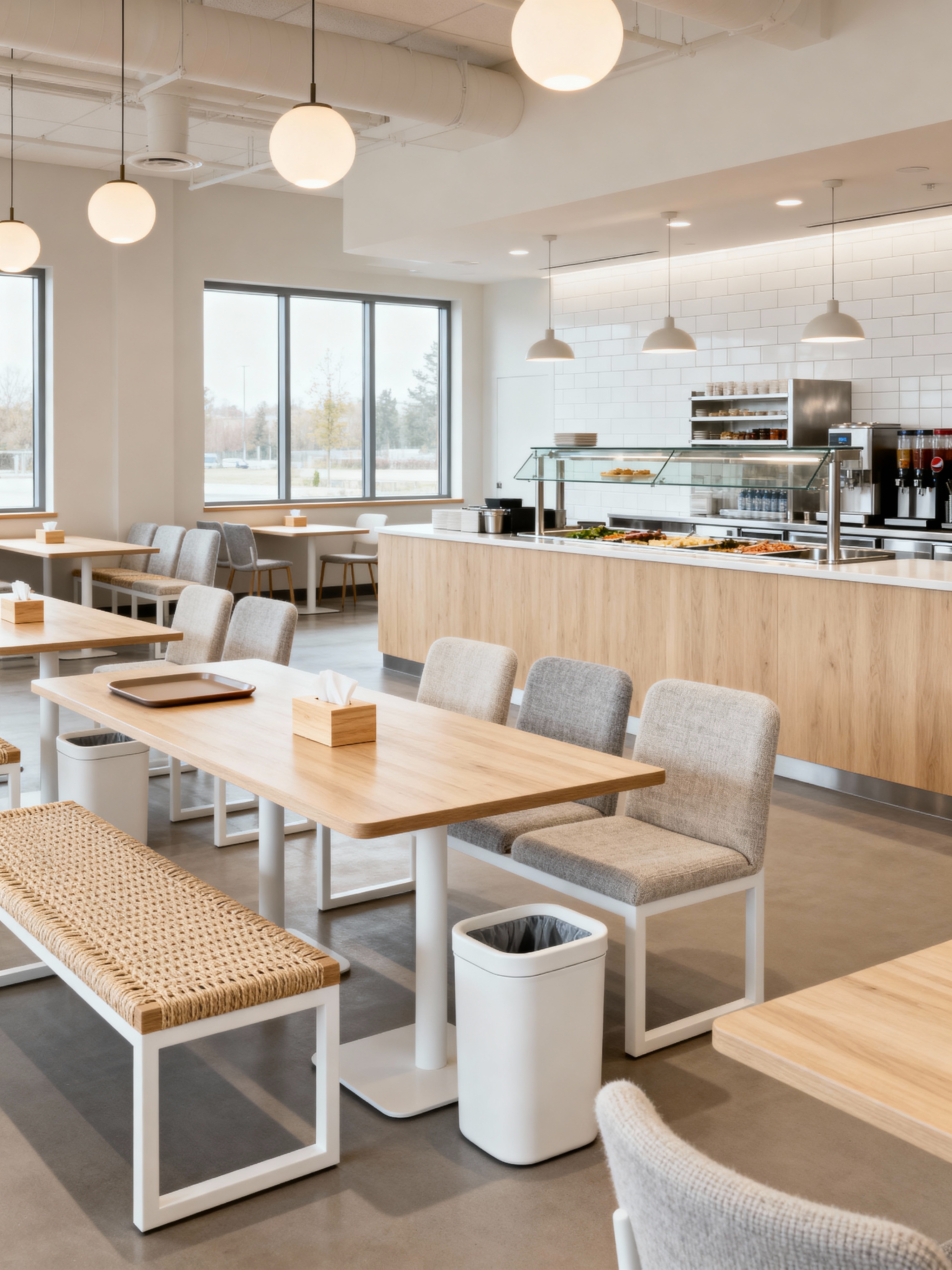 cafeteria with scandinavian style with dining tables and chairs and benches and trash bins and napkin dispensers and trays and beverage station and food service counter. . with neutral palette and textured fabrics and minimalist design and hygge and light wood and clean lines and natural light and functional furniture