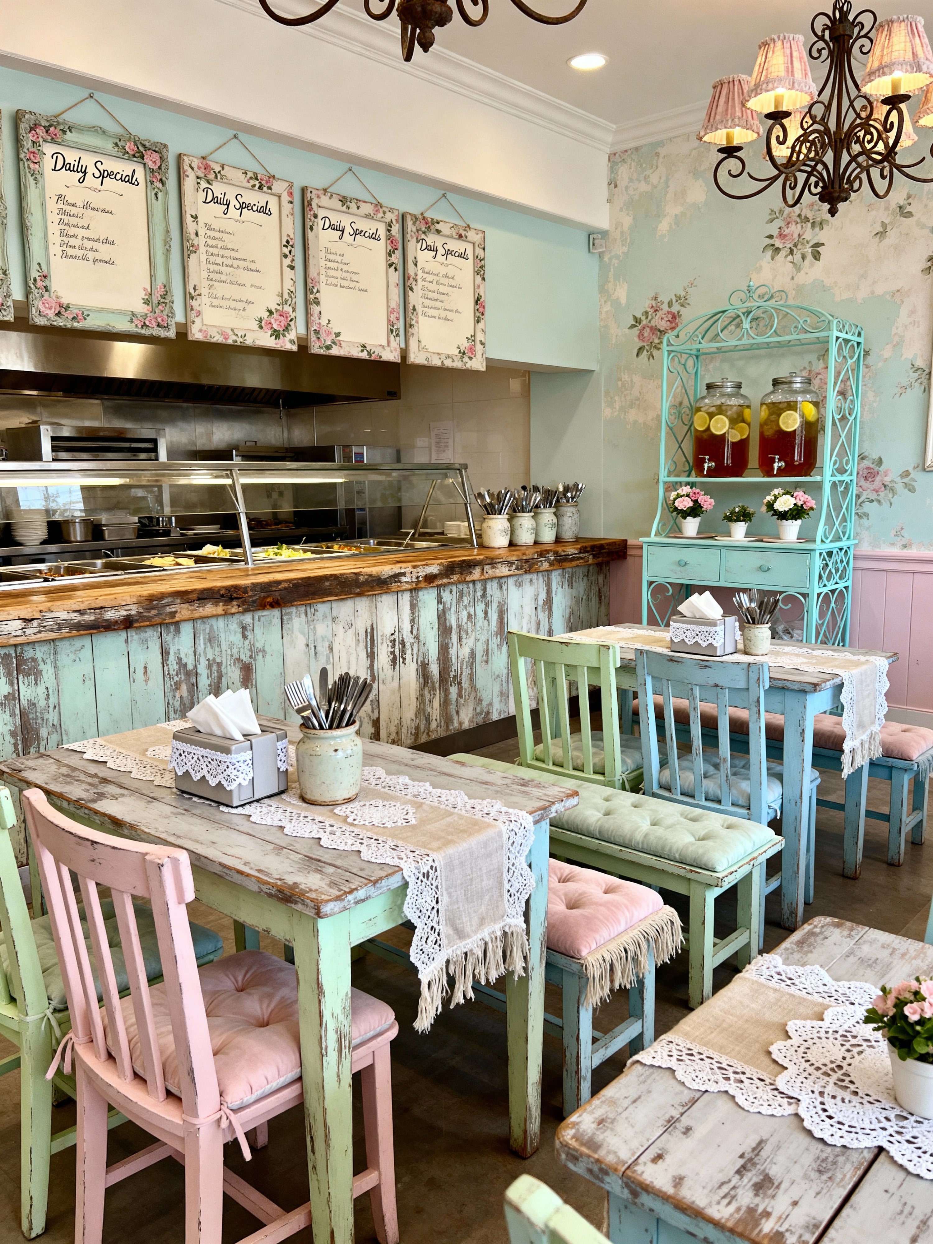 cafeteria with shabby chic style with trays and menu boards and napkin dispensers and utensils and chairs and food service counter and benches and beverage station. . with antique lace and feminine touches and floral patterns and distressed furniture and pastel colors and romantic style and weathered finishes and soft textures