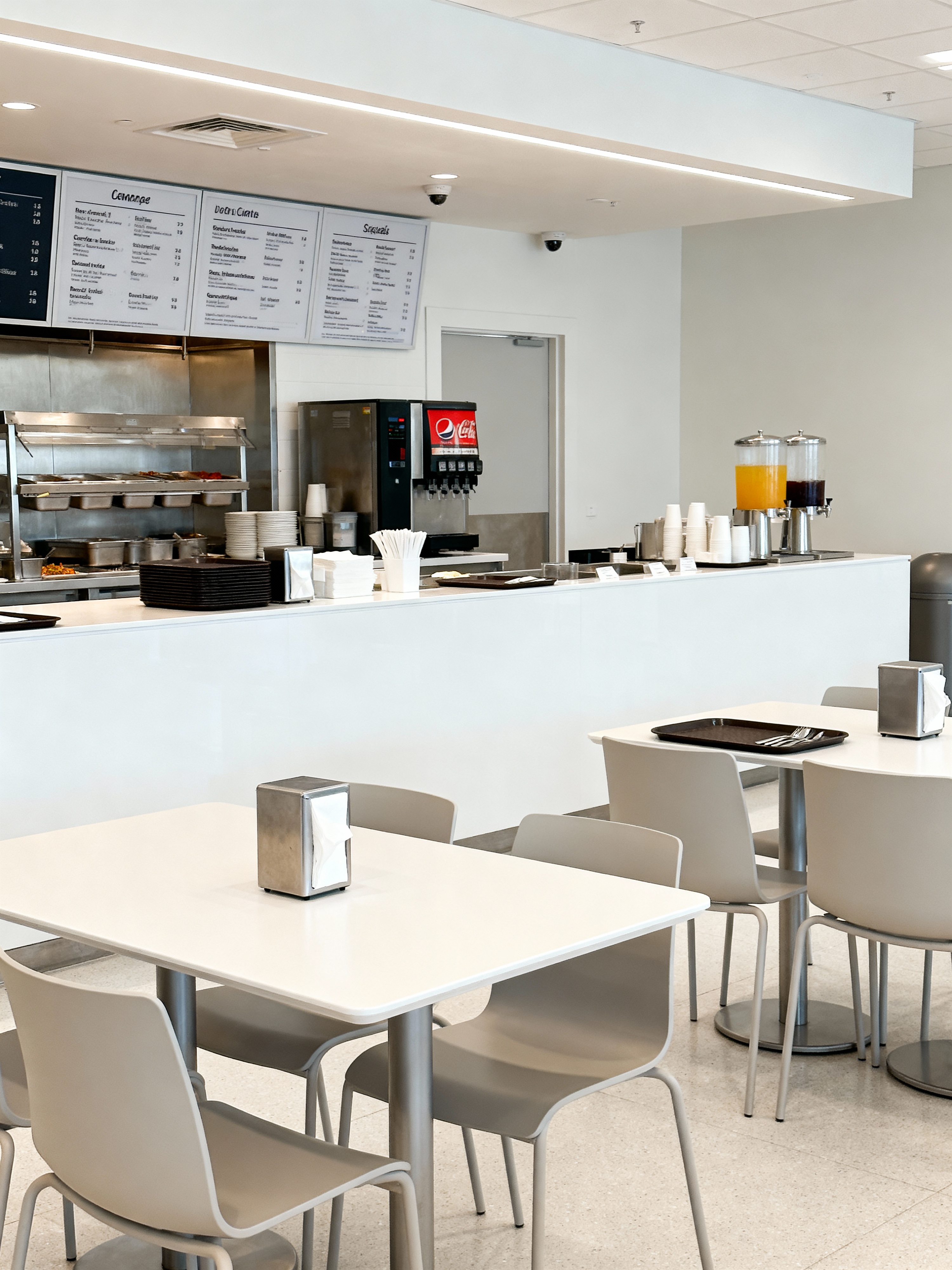 cafeteria with simple style with food service counter and menu boards and chairs and trays and beverage station and napkin dispensers and dining tables and utensils. . with pure simplicity and essential pieces and calm atmosphere and functional furniture and clean design and minimal decor and understated style and basic elements