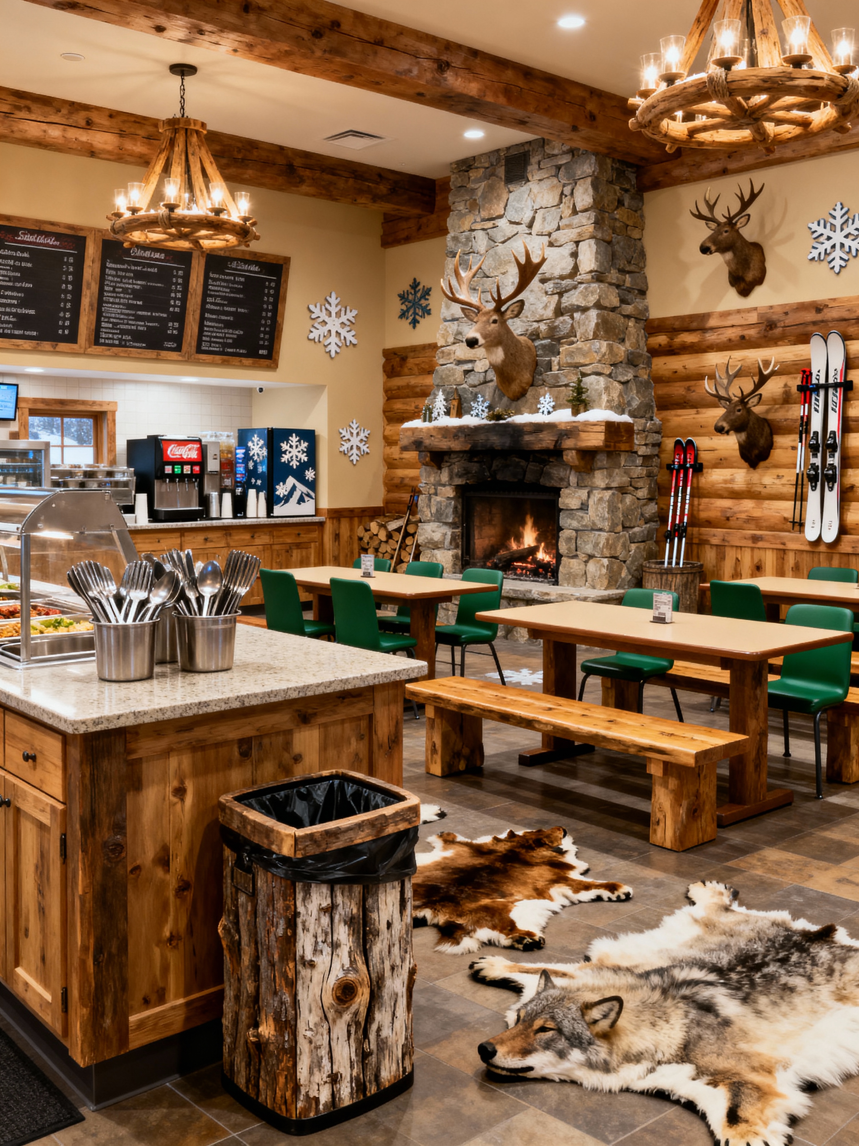 cafeteria with ski chalet style with utensils and food service counter and chairs and benches and menu boards and dining tables and beverage station and trash bins. . with nature-inspired and rustic and animal motifs and ski-themed decor and exposed wood and wooden walls and animal rugs and stone fireplace