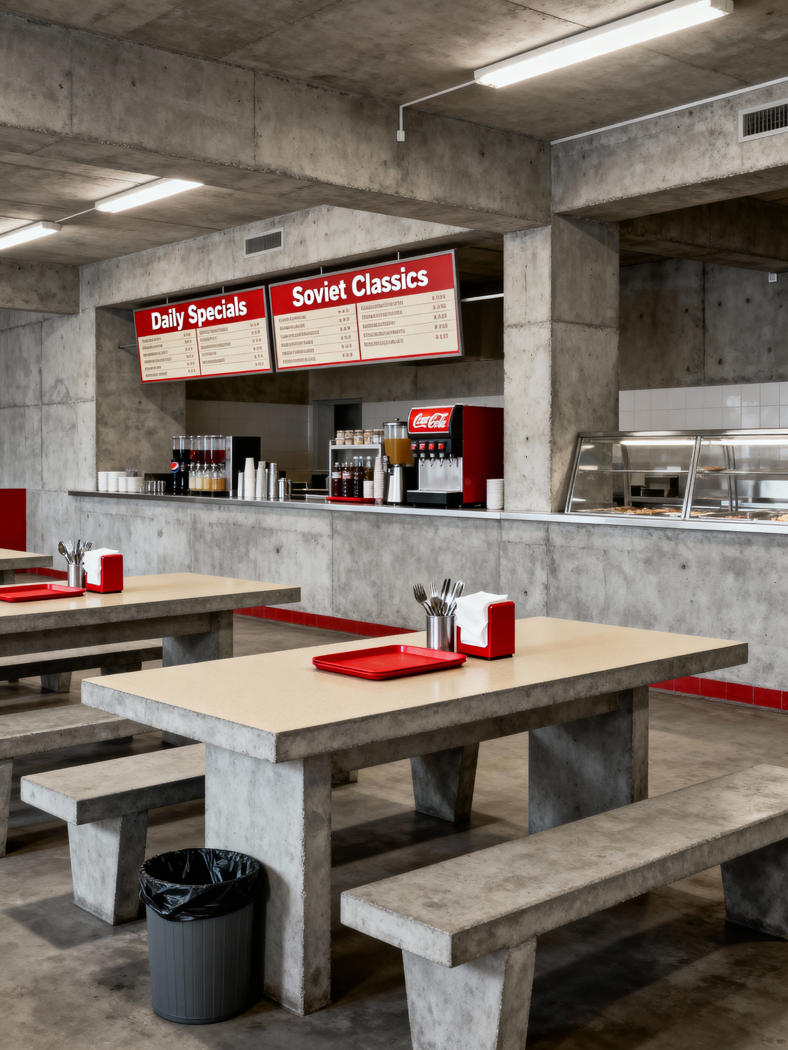 cafeteria with soviet style with dining tables and beverage station and utensils and napkin dispensers and trays and menu boards and benches and trash bins. . with concrete structures and utilitarian design and institutional look and monumental scale and functional furniture and communist design and brutalist style and soviet-era architecture