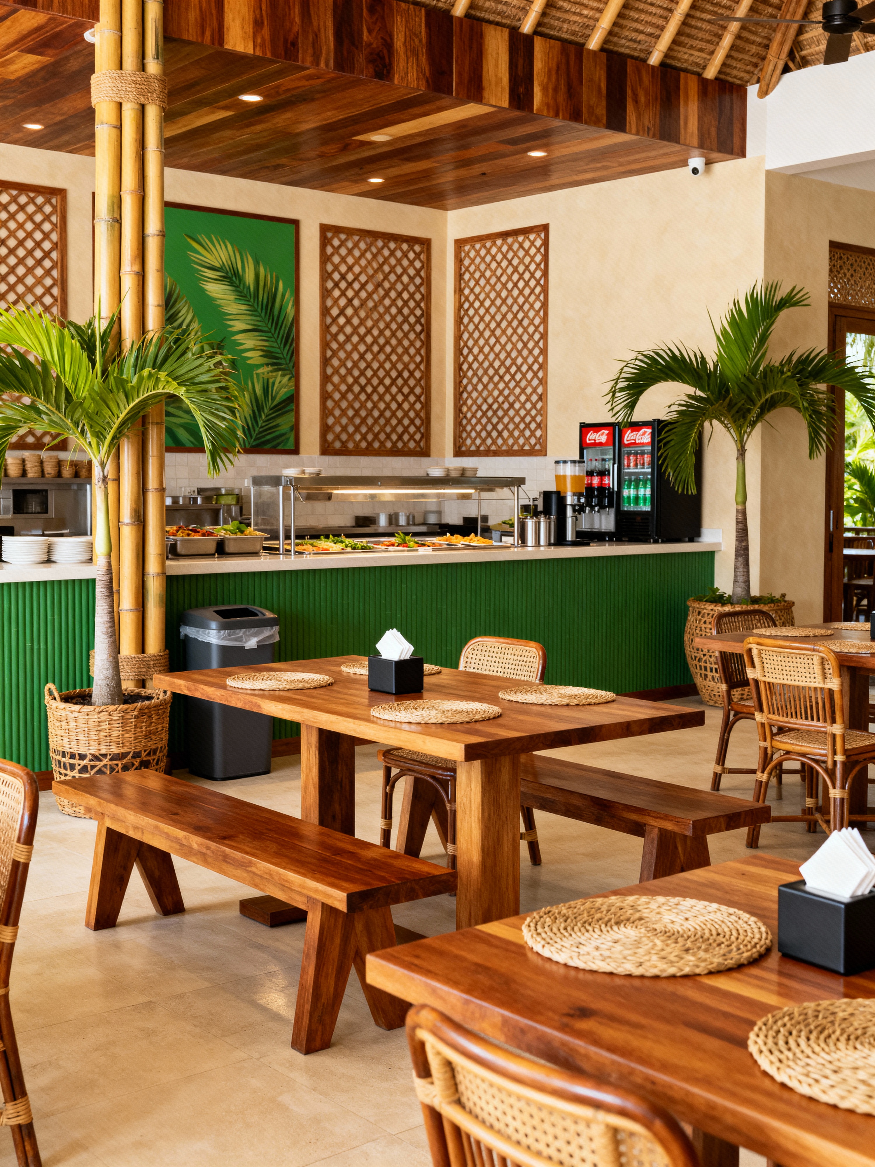 cafeteria with tropical style with benches and napkin dispensers and trash bins and beverage station and dining tables and utensils and chairs and food service counter. . with bamboo and palm leaves and teak and lattice prints and wicker and rattan and palm trees and cane motifs