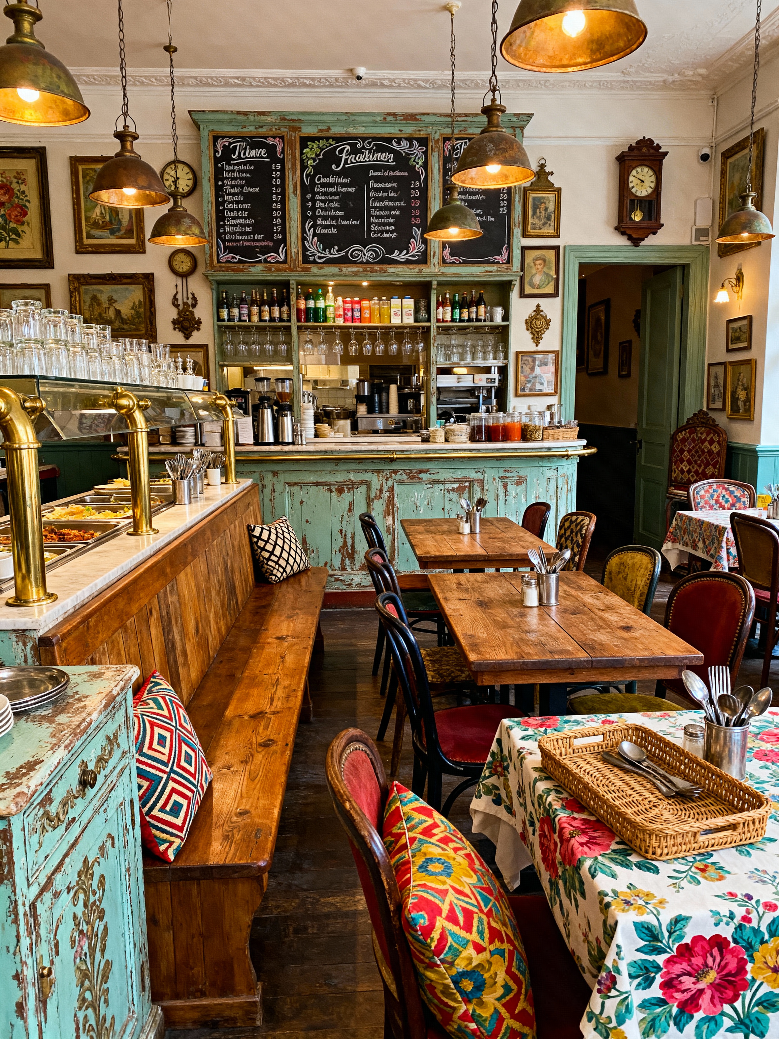cafeteria with vintage style with dining tables and menu boards and beverage station and benches and chairs and food service counter and utensils and trays. . with eclectic and ornate details and upcycled furniture and colorful accents and timeless pieces and bold patterns and shabby chic and antique decor