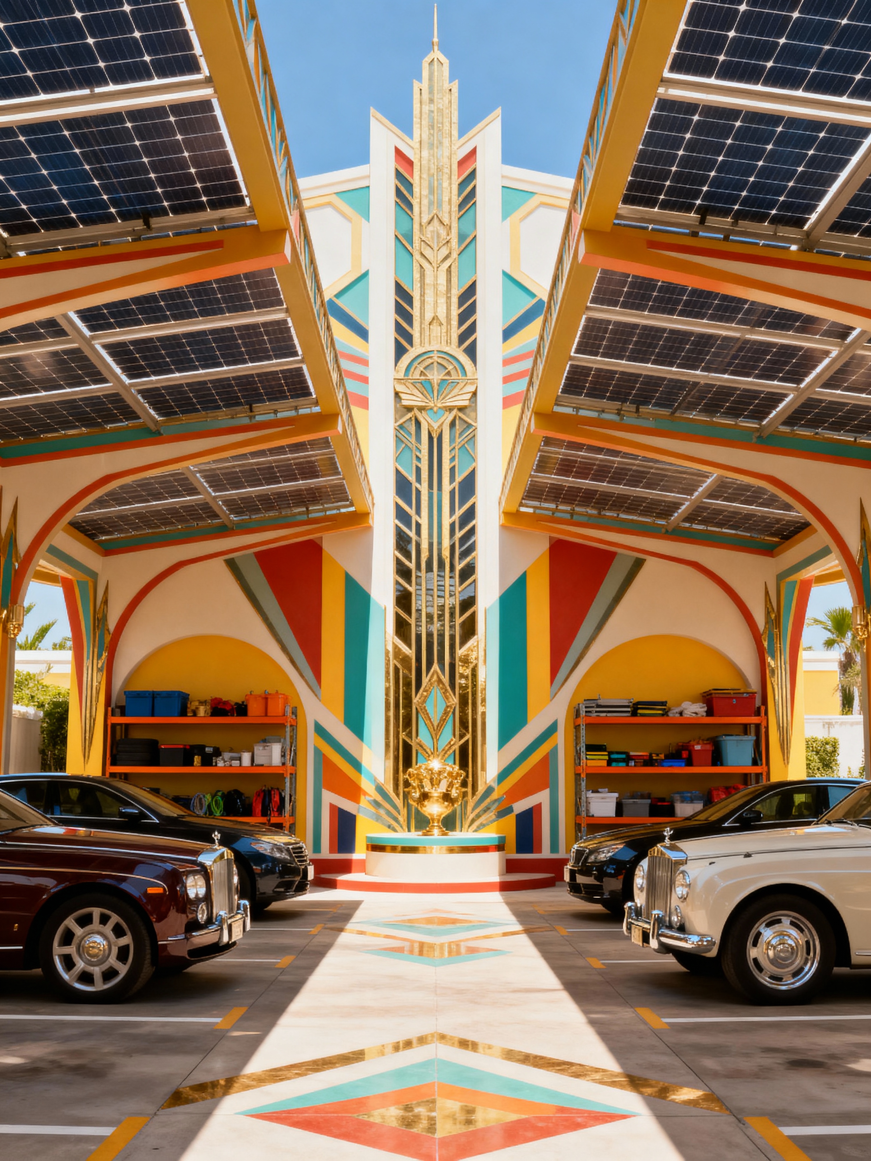 carport with art deco style with roof solar panels and carport roof and carport and canopy and storage racks and cars and roof solar panels. . with symmetrical designs and bright and cheerful colors and rich colors and geometric shapes and angular shapes and luxury and abstract patterns and exuberant shapes