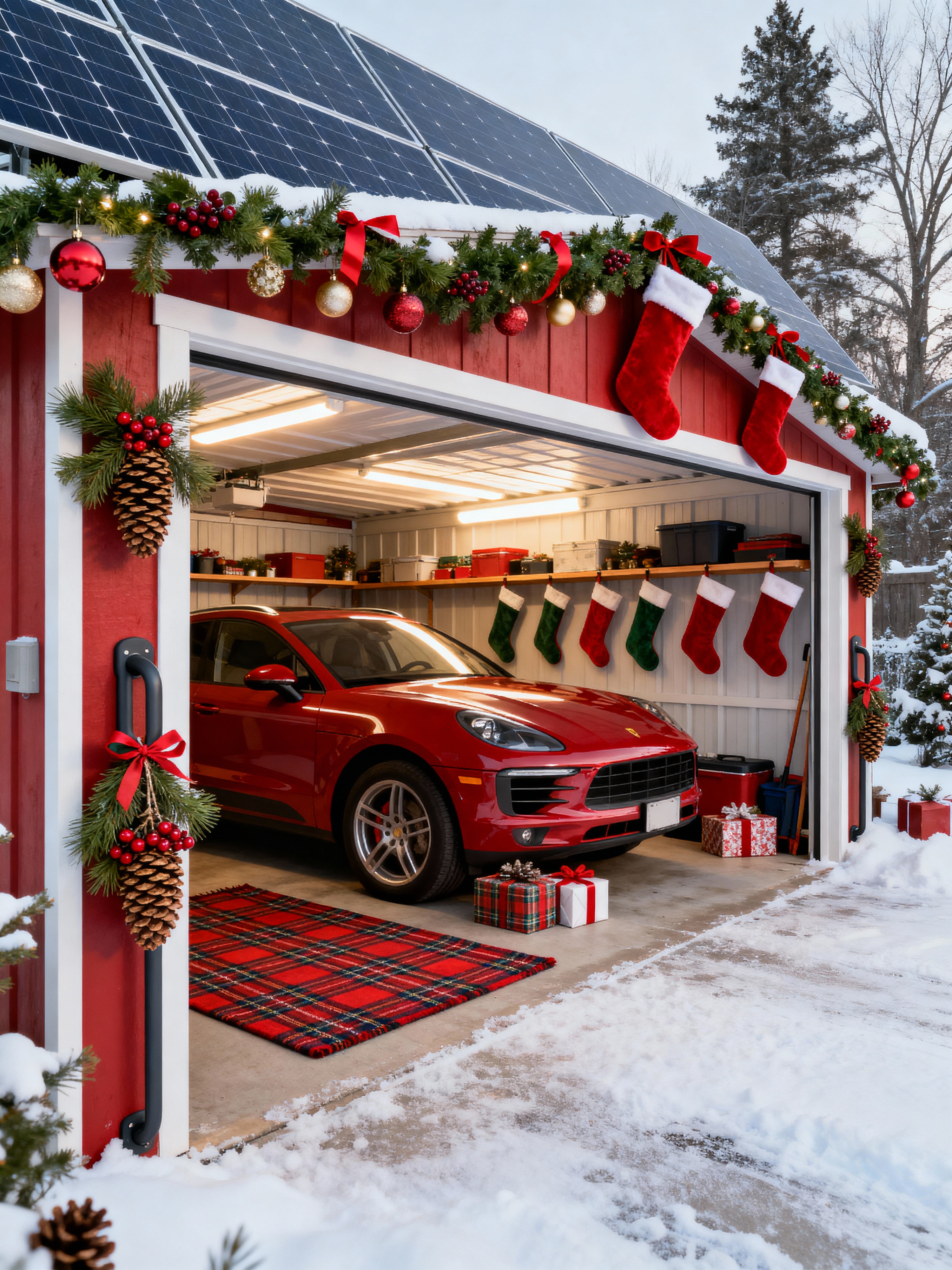 carport with christmas style with roof solar panels and cars and storage racks and carport and carport roof and canopy and roof solar panels. . with christmas ornaments and ribbons and a few big socks hanging and berries and greenery draped and snow outside and tie pinecones and berries and plaid rugs and giftwrapped gifts