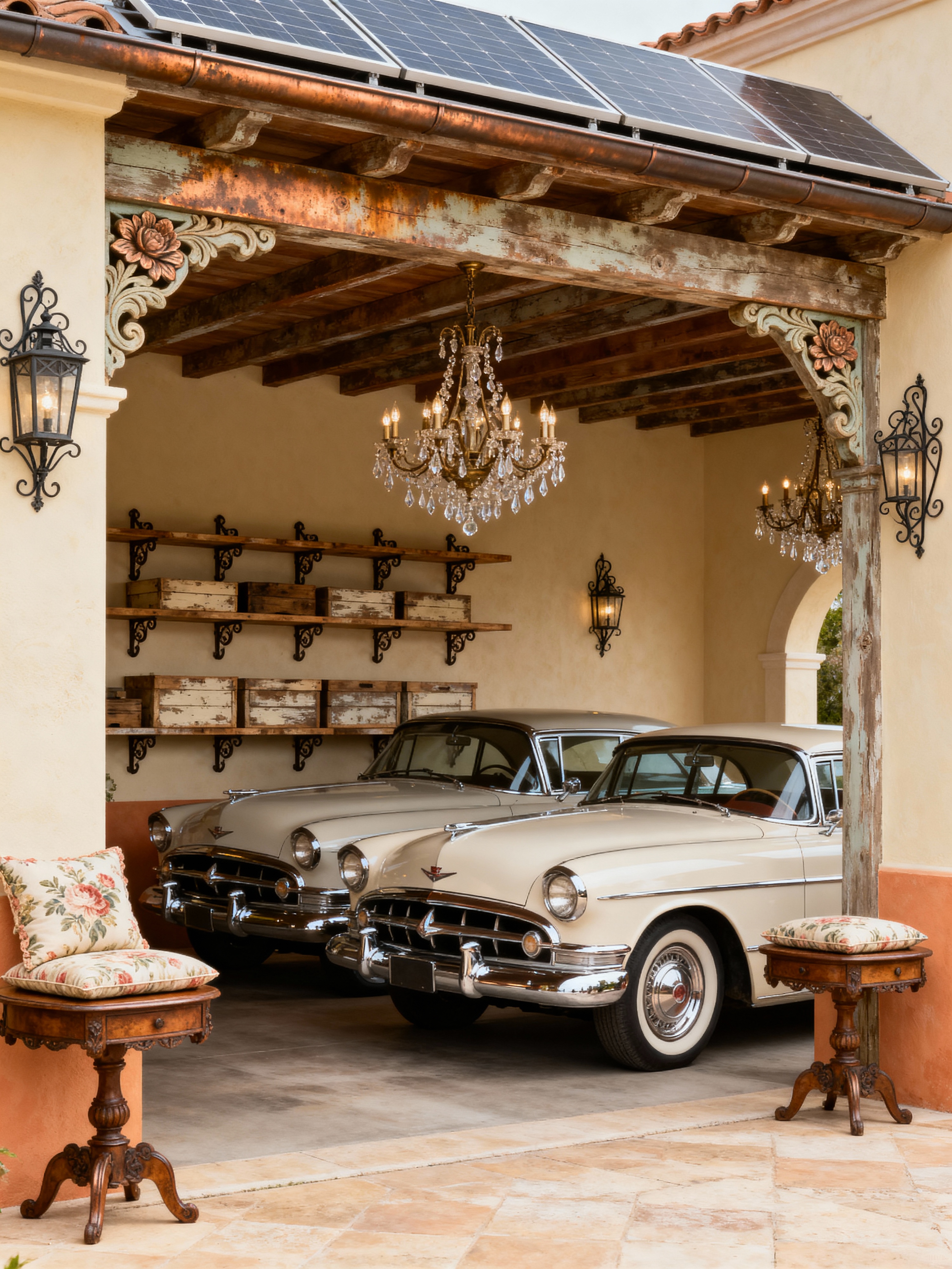 carport with french country style with cars and roof solar panels and storage racks and carport and canopy and carport roof and cars. . with vintage furniture and distressed wood and country elegance and antique decor and warm tones and chandeliers and ornate details and elegant rustic