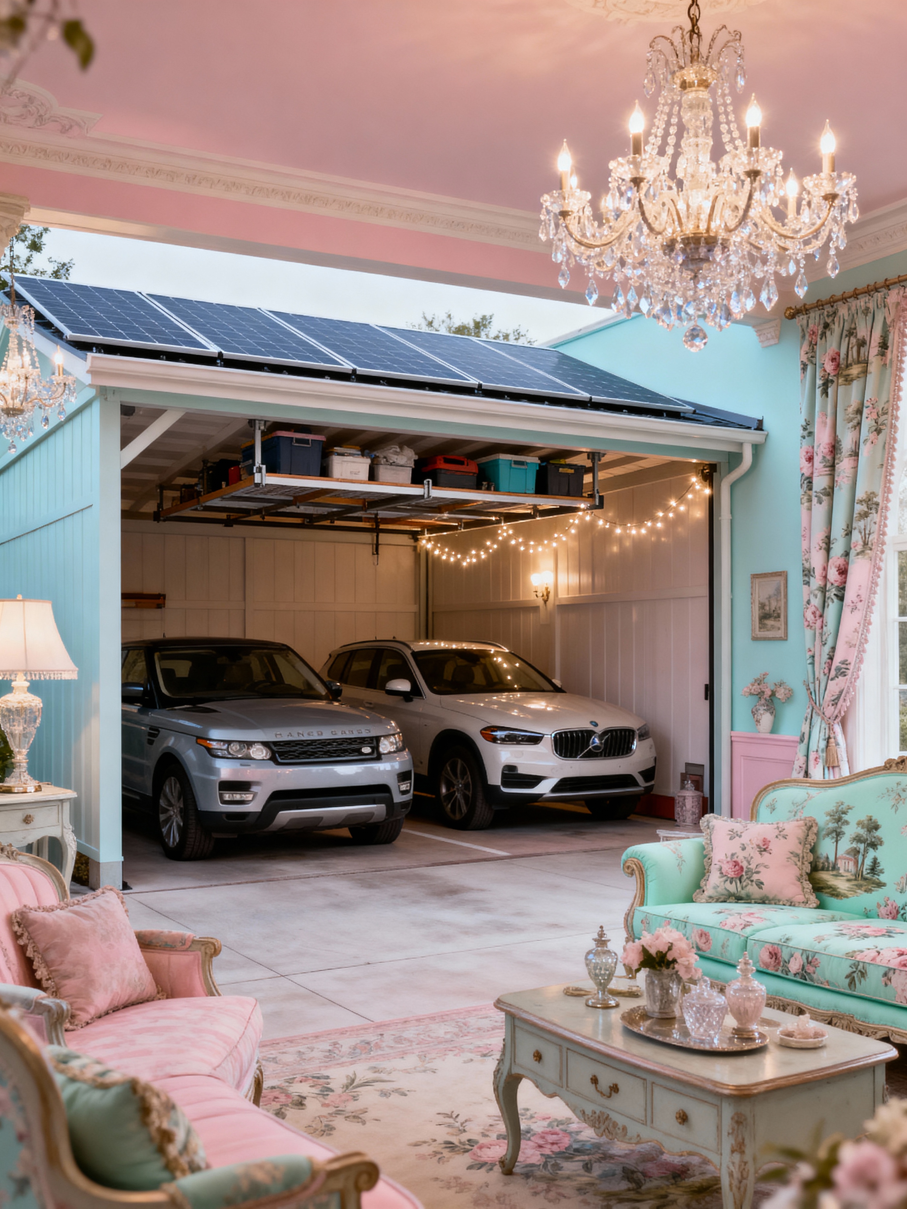carport with french style with canopy and roof solar panels and carport and cars and carport roof and storage racks and canopy. . with crystal accents and soft pastels and romantic style and refined luxury and provincial charm and elegant details and toile patterns and classic beauty
