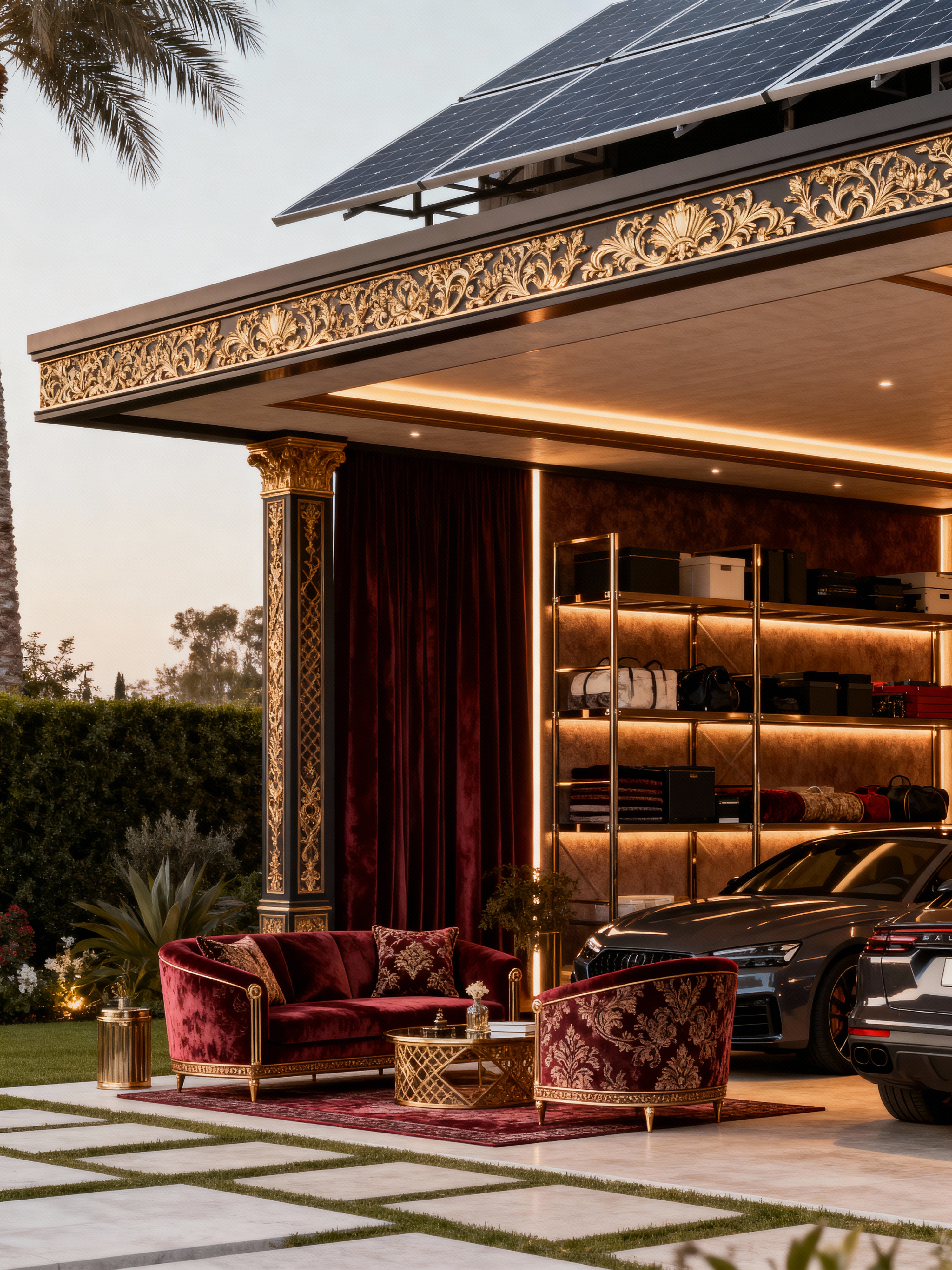 carport with luxury style with canopy and roof solar panels and storage racks and carport roof and cars and carport and canopy. . with high-end materials and premium finishes and exclusive design and rich textures and expensive fabrics and designer furniture and opulent details and sophisticated style