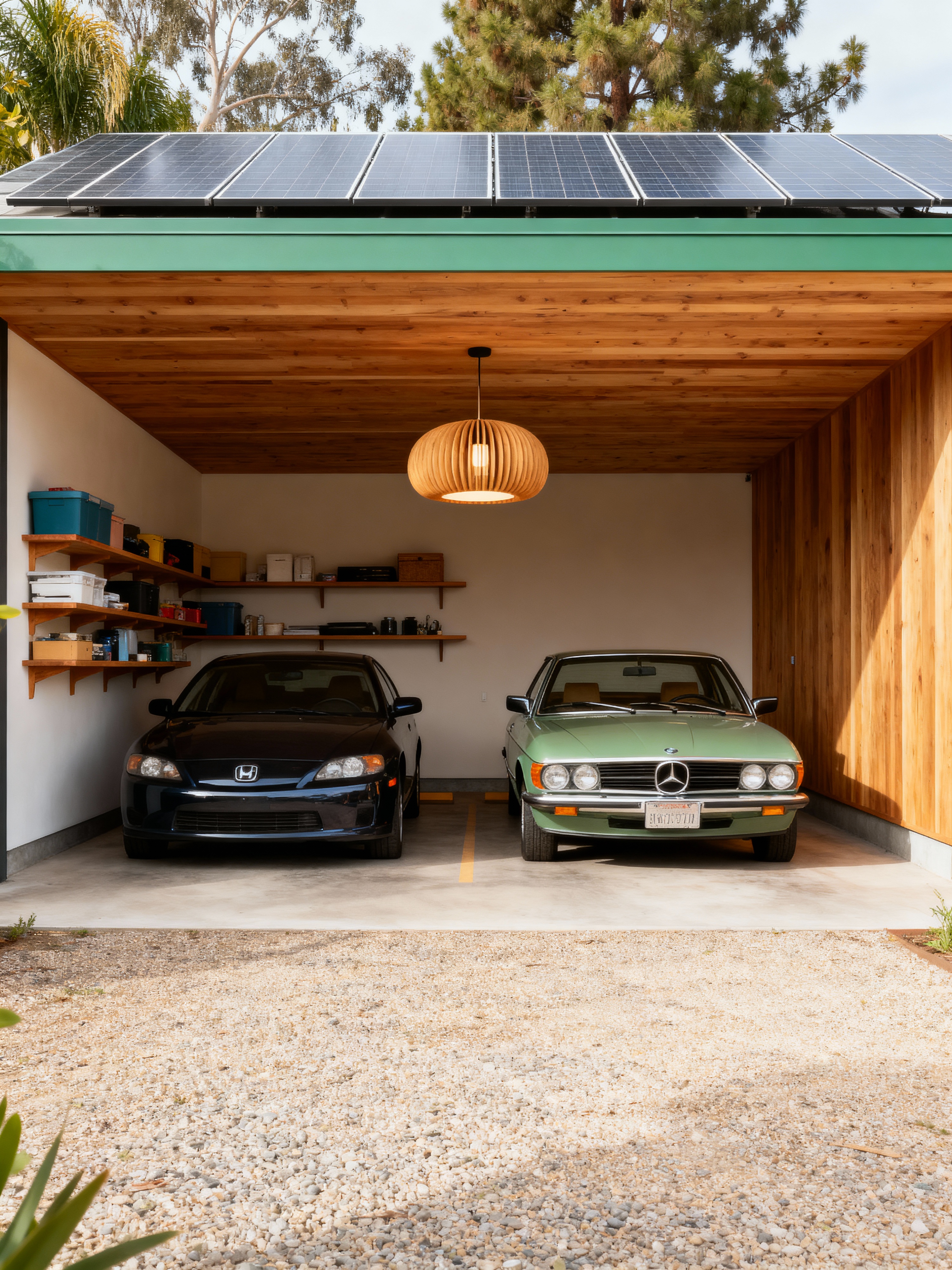 carport with midcentury modern style with canopy and carport roof and carport and cars and storage racks and roof solar panels and canopy. . with vibrant colors and natural and manmade materials and minimalist and organic and geometric shapes and muted tones and wood pendant light mid century modern chandelier and function over form and clean lines