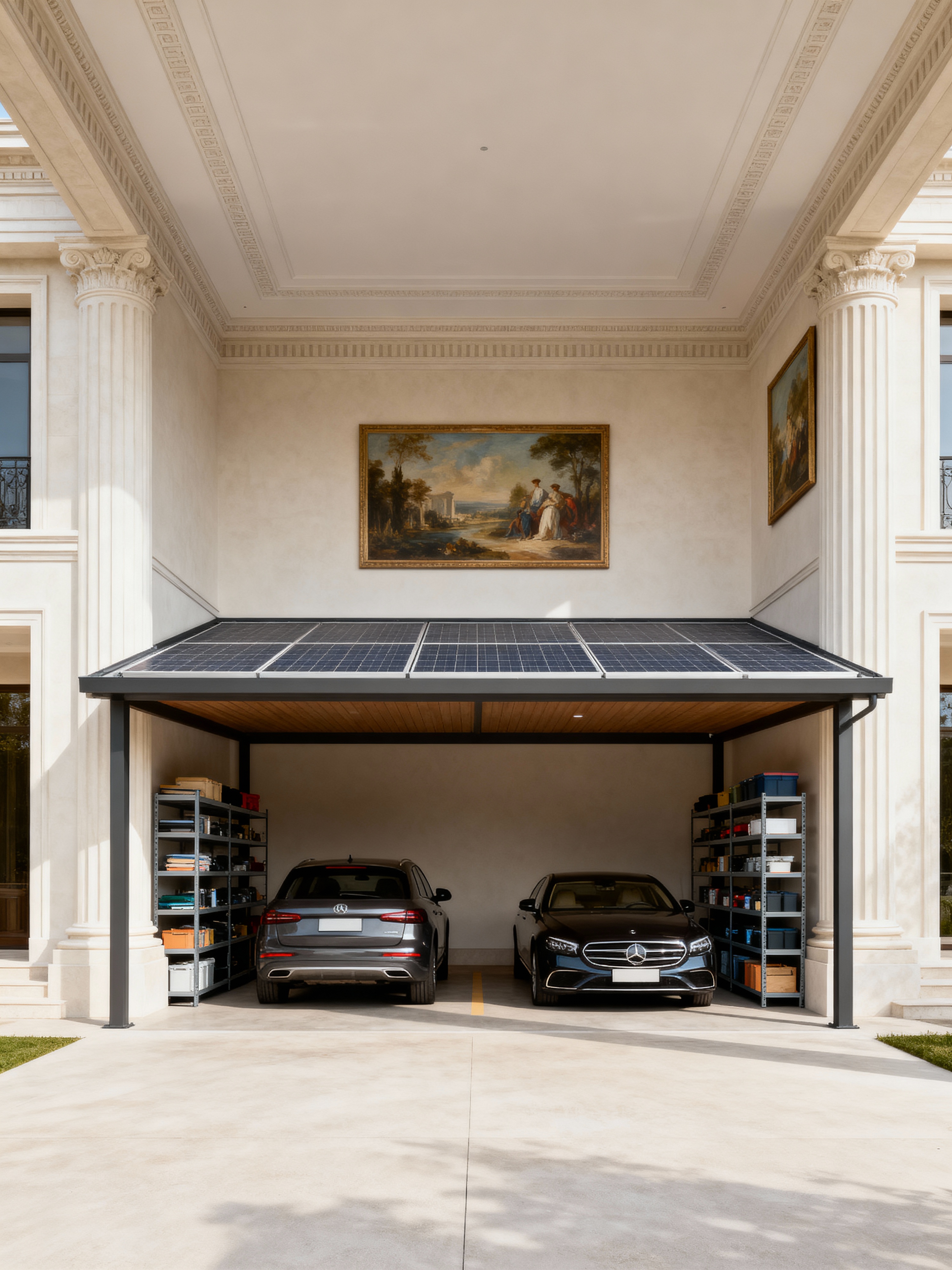 carport with neoclassic style with canopy and storage racks and cars and carport roof and carport and roof solar panels and canopy. . with elegant and sophisticated and thoughtful minimalism and high ceilings and timeless artwork and spacious rooms and emphasized horizontal and vertical lines and geometric decorative elements and classical architectural details
