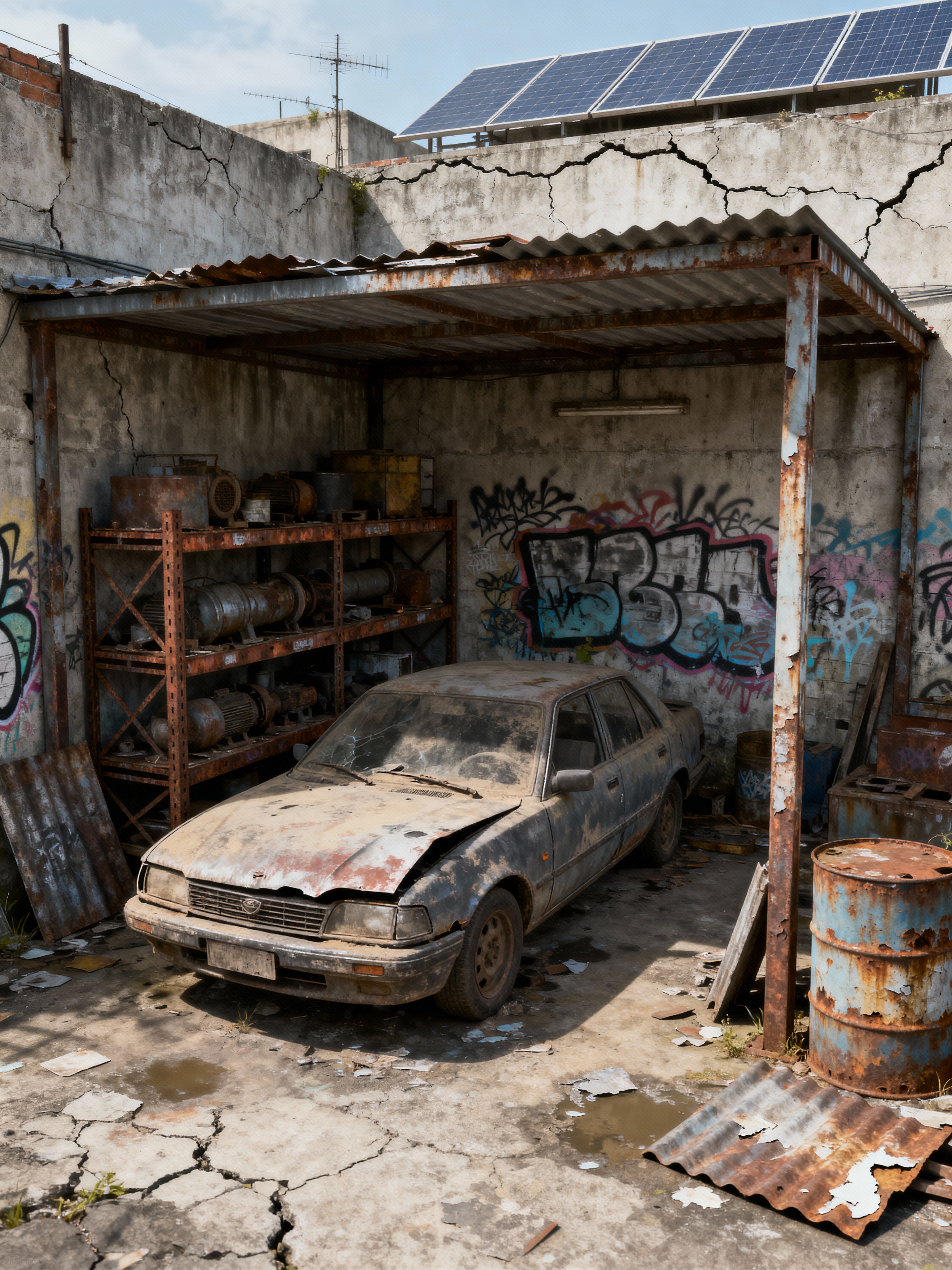 carport with post-apocalyptic style with canopy and carport and storage racks and roof solar panels and carport roof and cars and canopy. . with graffiti on walls and desolate and cracked concrete walls and neglected atmosphere and weathered materials and industrial elements and run-down favela style and gritty atmosphere