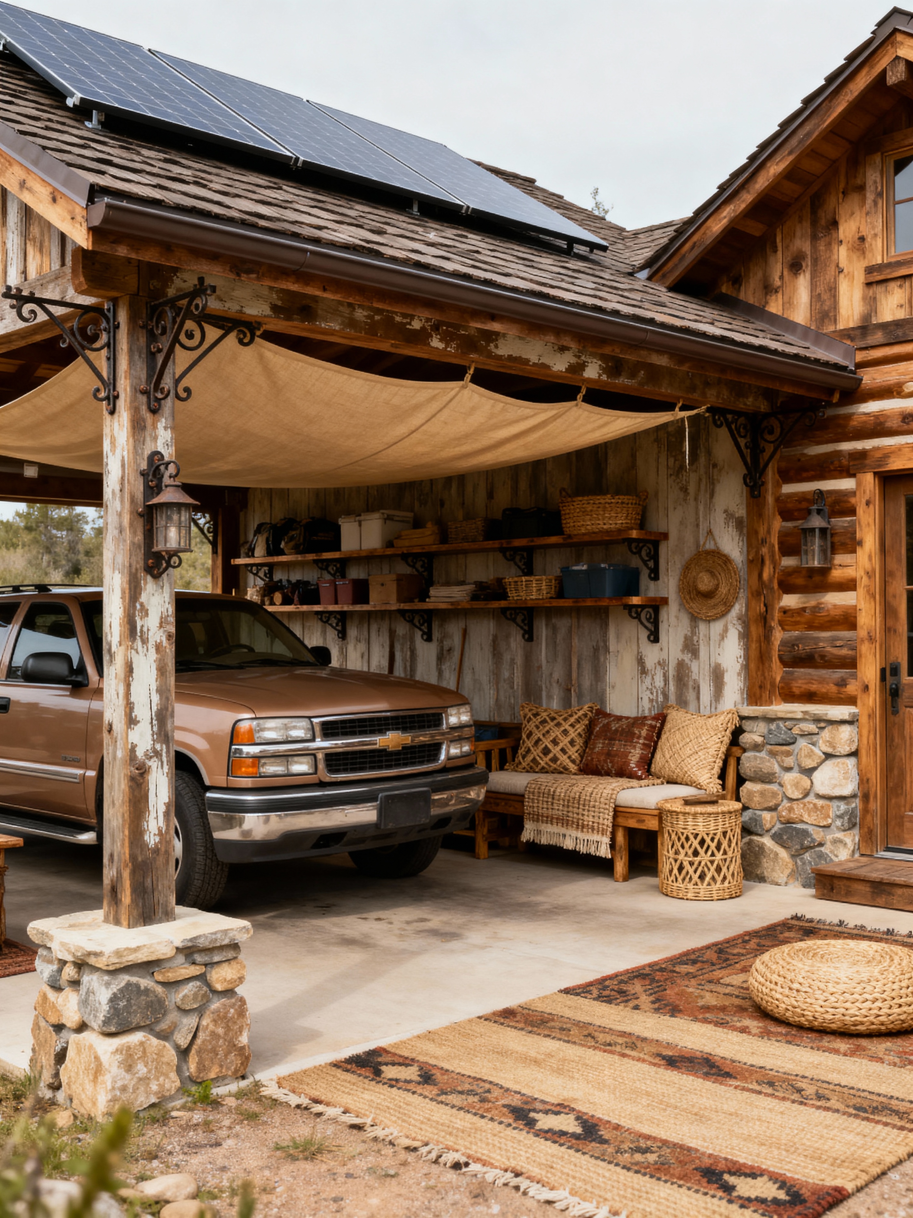 carport with rustic style with roof solar panels and cars and canopy and storage racks and carport roof and carport and roof solar panels. . with cozy cabin and country style and distressed finishes and stone accents and earthy tones and iron fixtures and woven textures and natural wood